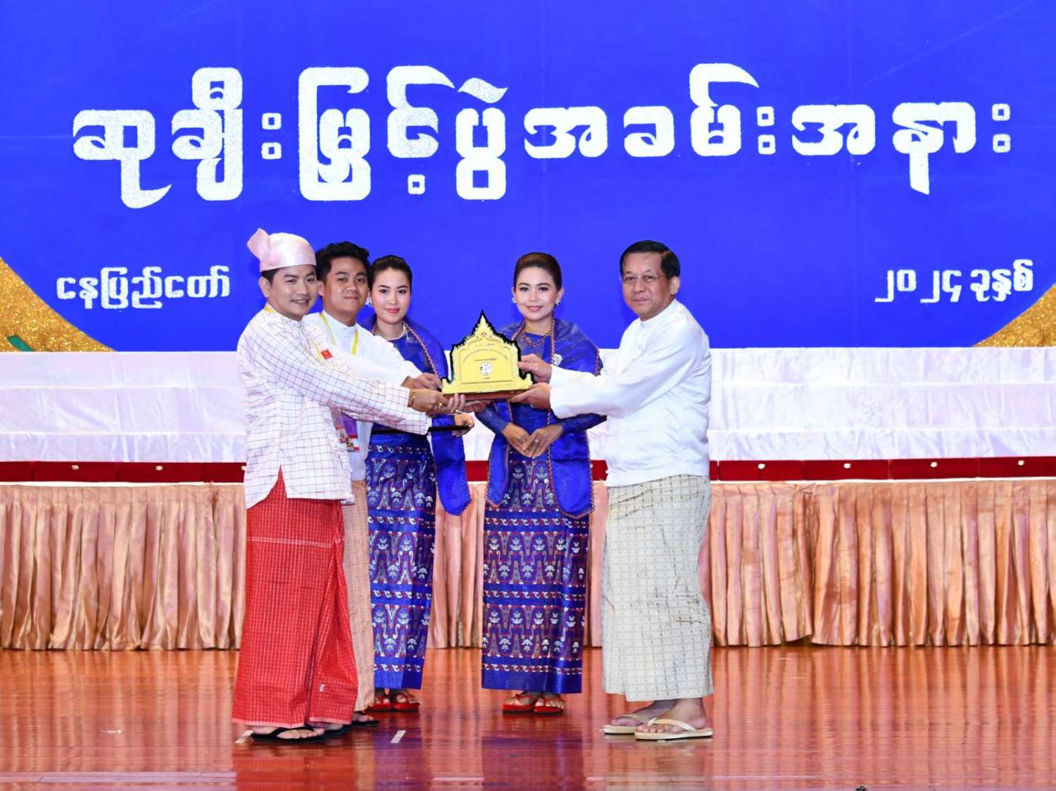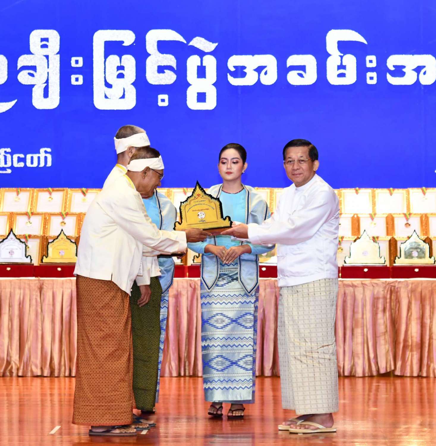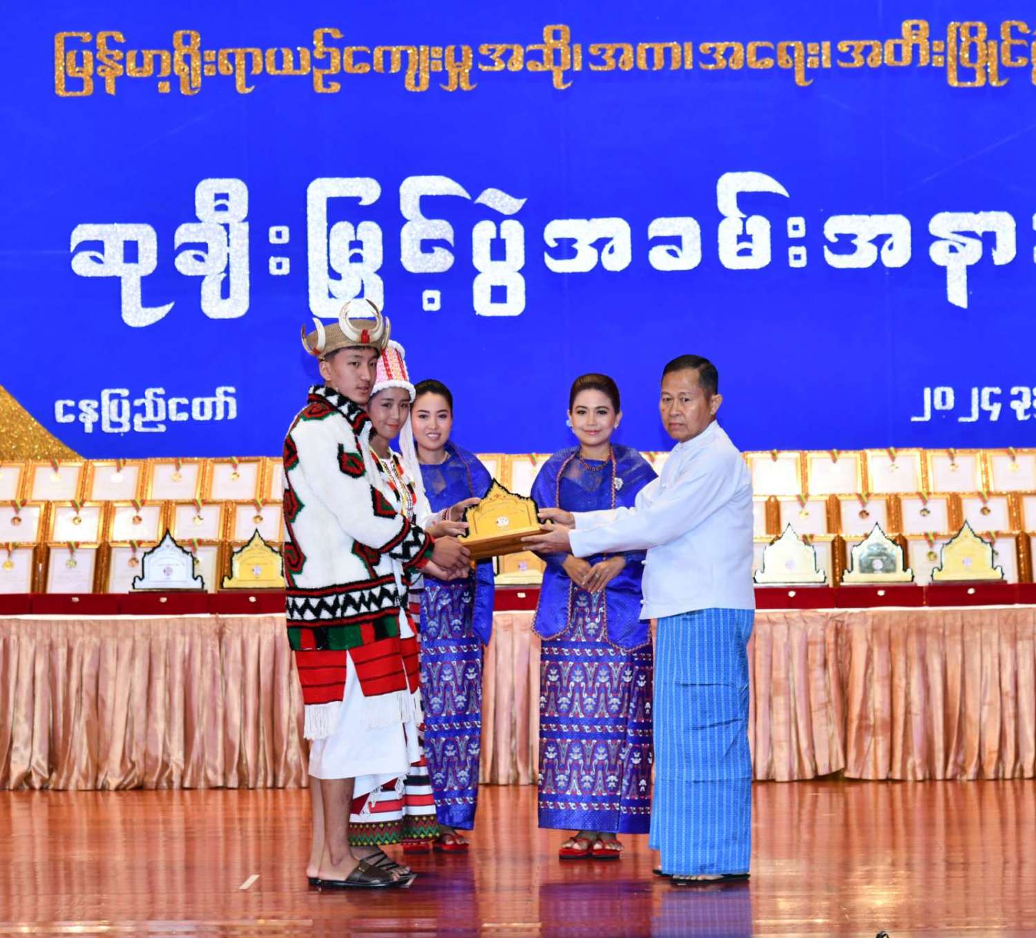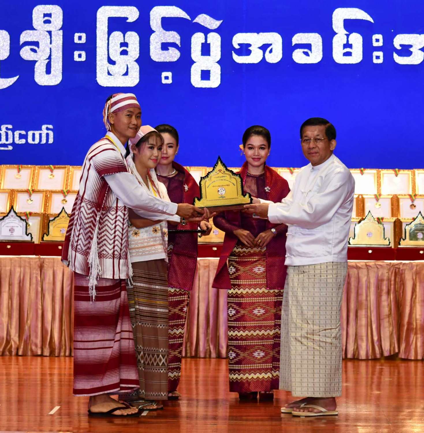 ထို့နောက် ဆုများပေးအပ်ချီးမြှင့်ရာ နိုင်ငံတော်စီမံအုပ်ချုပ်ရေးကောင်စီဥက္ကဋ္ဌ နိုင်ငံတာ်ဝန်ကြီးချုပ်က ကချင်၊ ကယား၊ ကရင်၊ ချင်း၊ မွန်၊ ရခိုင်နှင့် ရှမ်းပြည်နယ်တို့မှ တိုင်းရင်းသားရိုးရာ အကအဖွဲ့များကိုလည်းကောင်း၊ နိုင်ငံတော်စီမံအုပ်ချုပ်ရေးကောင်စီဥက္ကဋ္ဌ နိုင်ငံတာ်ဝန်ကြီးချုပ်၏ ဇနီးက စစ်ကိုင်းတိုင်းဒေသကြီး၊ တနင်္သာရီတိုင်းဒေသကြီး၊ ပဲခူးတိုင်းဒေသကြီး၊ မကွေးတိုင်းဒေသကြီး၊ မန္တလေးတိုင်းဒေသကြီး၊ ရန်ကုန်တိုင်းဒေသကြီးနှင့် ဧရာဝတီတိုင်းဒေသကြီးတို့မှ ကျေးလက်ရိုးရာယဉ်ကျေးမှုအဖွဲ့များကို လည်းကောင်း ဂုဏ်ပြုဆုများ ပေးအပ်ချီးမြှင့်သည်။
