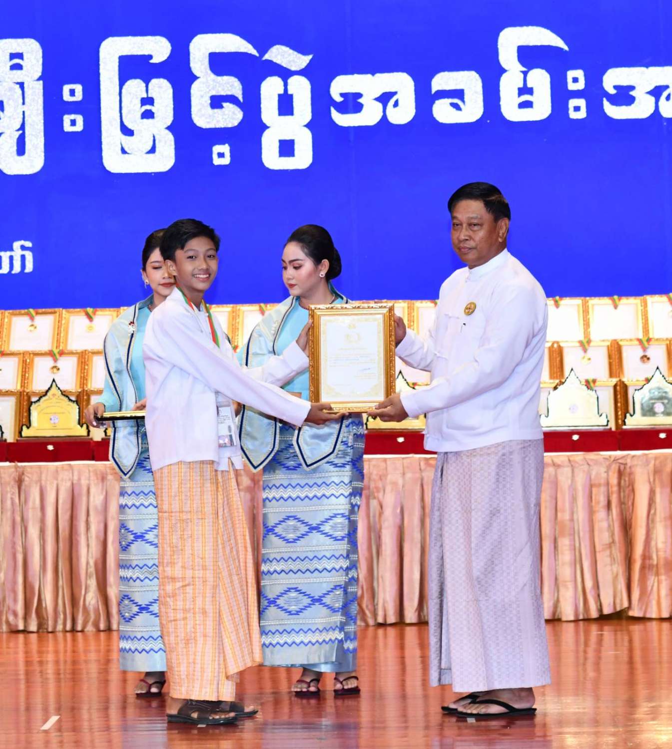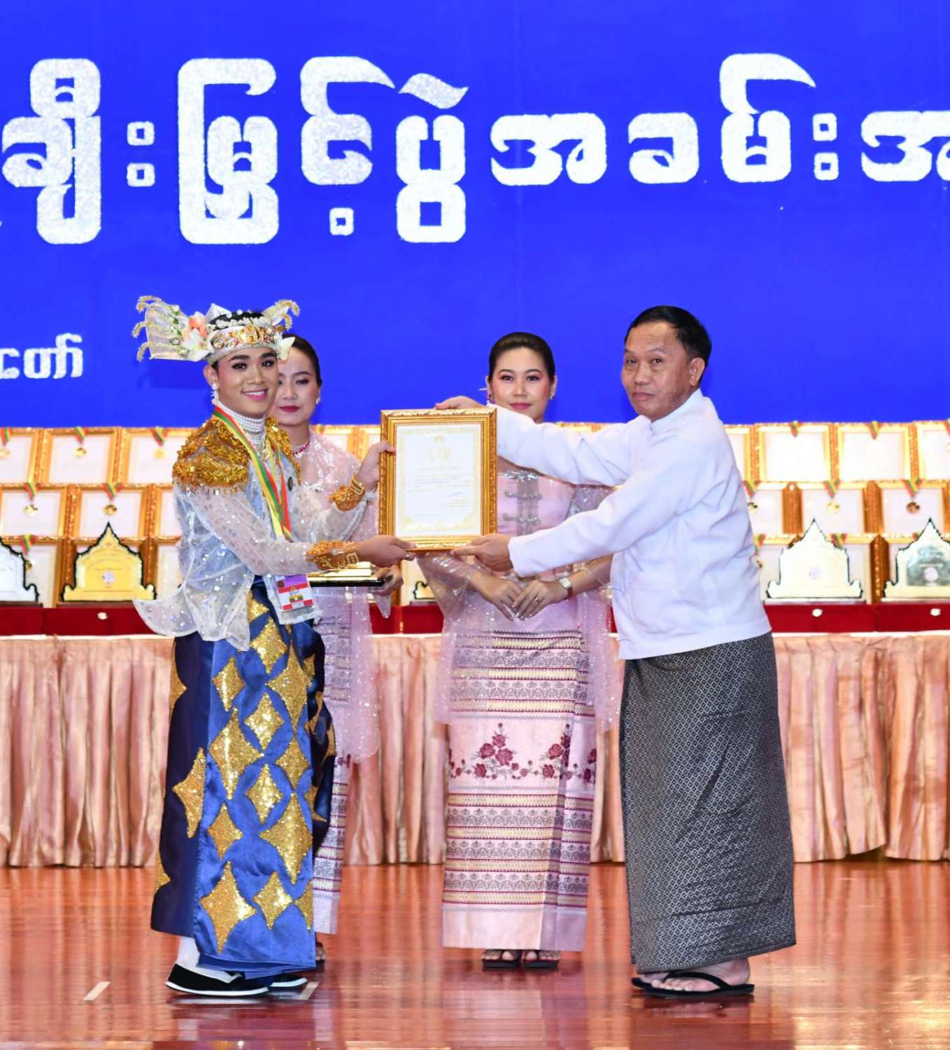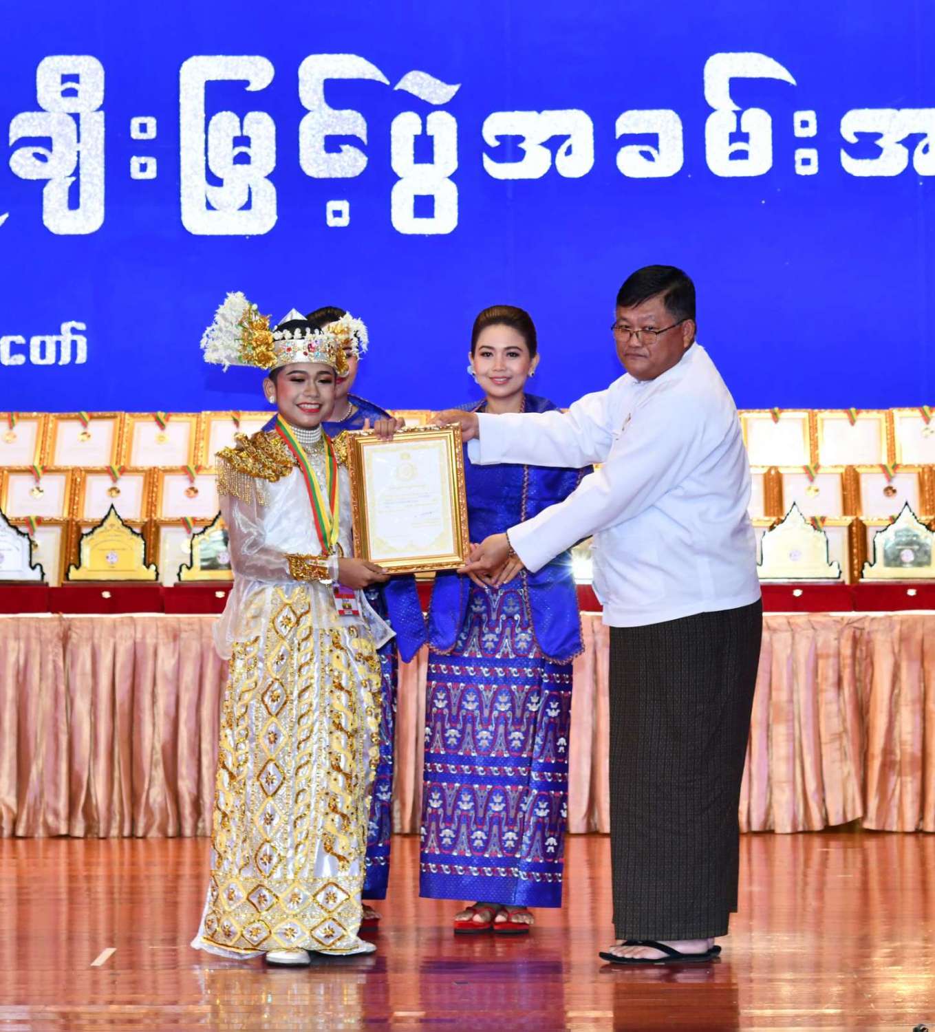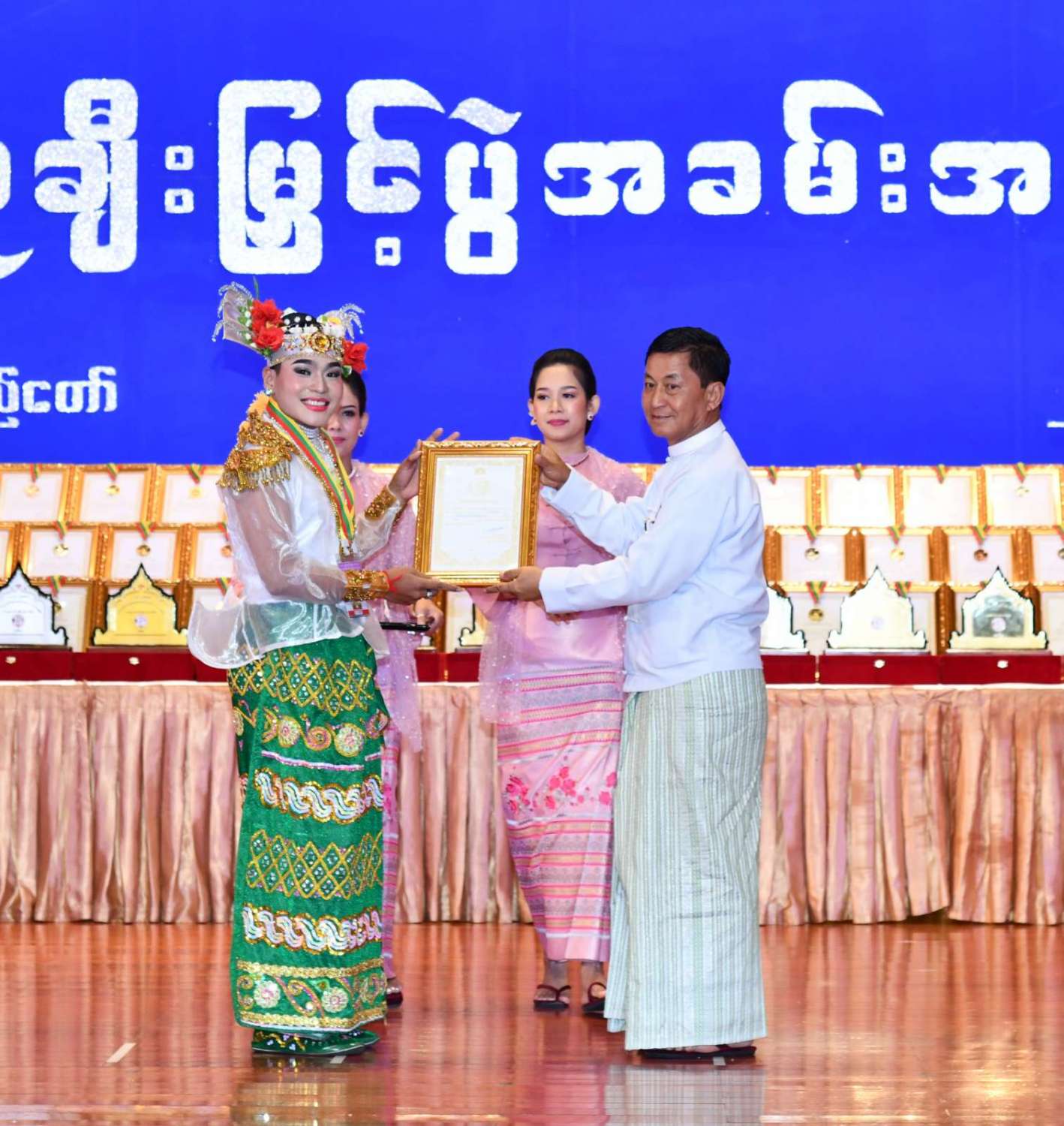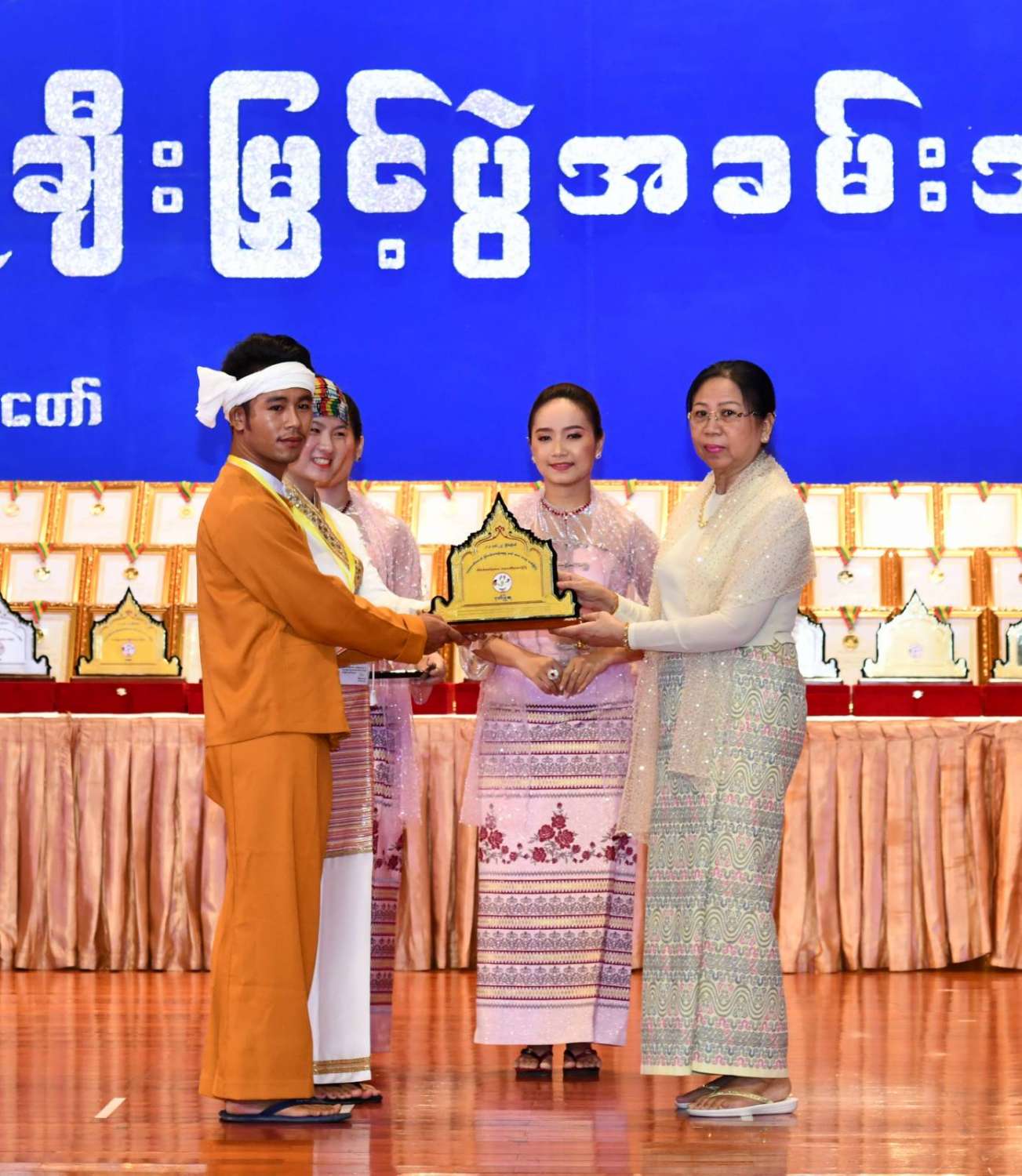 ထို့နောက် ဆုများပေးအပ်ချီးမြှင့်ရာ နိုင်ငံတော်စီမံအုပ်ချုပ်ရေးကောင်စီဥက္ကဋ္ဌ နိုင်ငံတာ်ဝန်ကြီးချုပ်က ကချင်၊ ကယား၊ ကရင်၊ ချင်း၊ မွန်၊ ရခိုင်နှင့် ရှမ်းပြည်နယ်တို့မှ တိုင်းရင်းသားရိုးရာ အကအဖွဲ့များကိုလည်းကောင်း၊ နိုင်ငံတော်စီမံအုပ်ချုပ်ရေးကောင်စီဥက္ကဋ္ဌ နိုင်ငံတာ်ဝန်ကြီးချုပ်၏ ဇနီးက စစ်ကိုင်းတိုင်းဒေသကြီး၊ တနင်္သာရီတိုင်းဒေသကြီး၊ ပဲခူးတိုင်းဒေသကြီး၊ မကွေးတိုင်းဒေသကြီး၊ မန္တလေးတိုင်းဒေသကြီး၊ ရန်ကုန်တိုင်းဒေသကြီးနှင့် ဧရာဝတီတိုင်းဒေသကြီးတို့မှ ကျေးလက်ရိုးရာယဉ်ကျေးမှုအဖွဲ့များကို လည်းကောင်း ဂုဏ်ပြုဆုများ ပေးအပ်ချီးမြှင့်သည်။