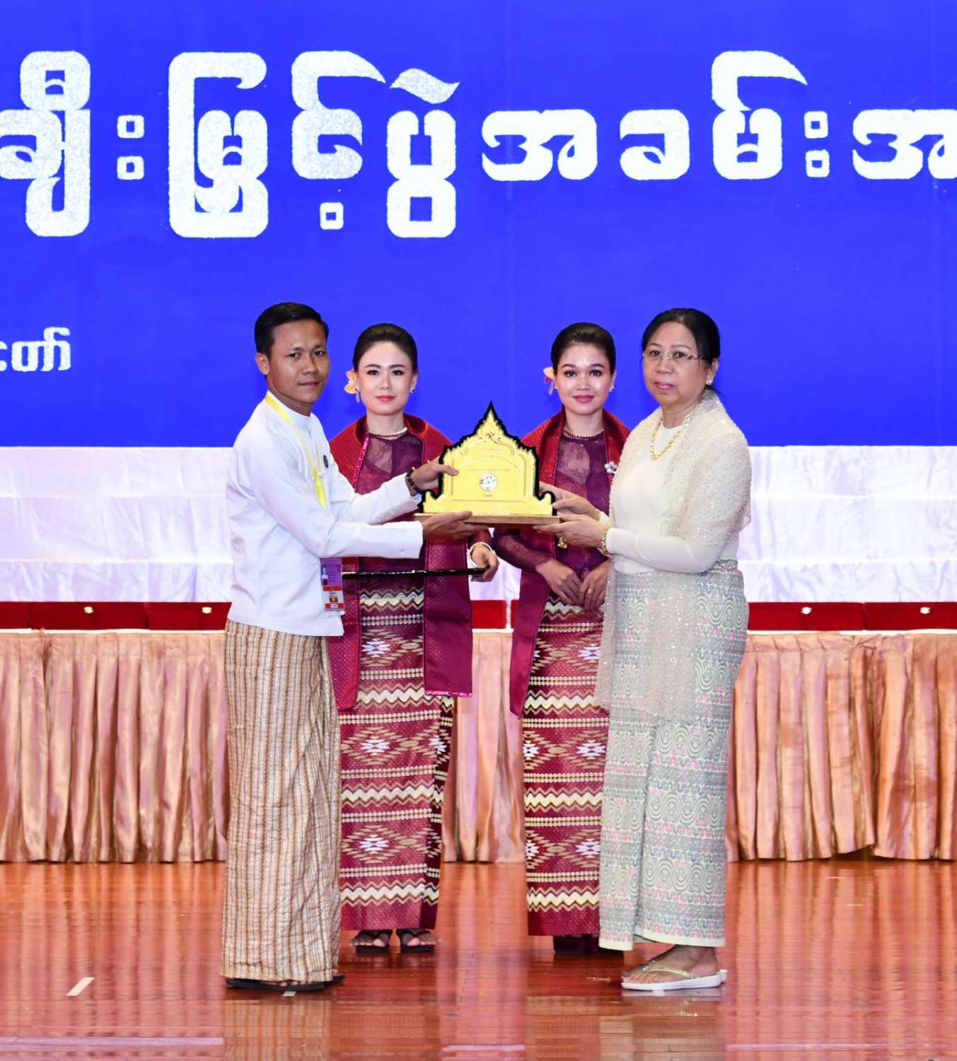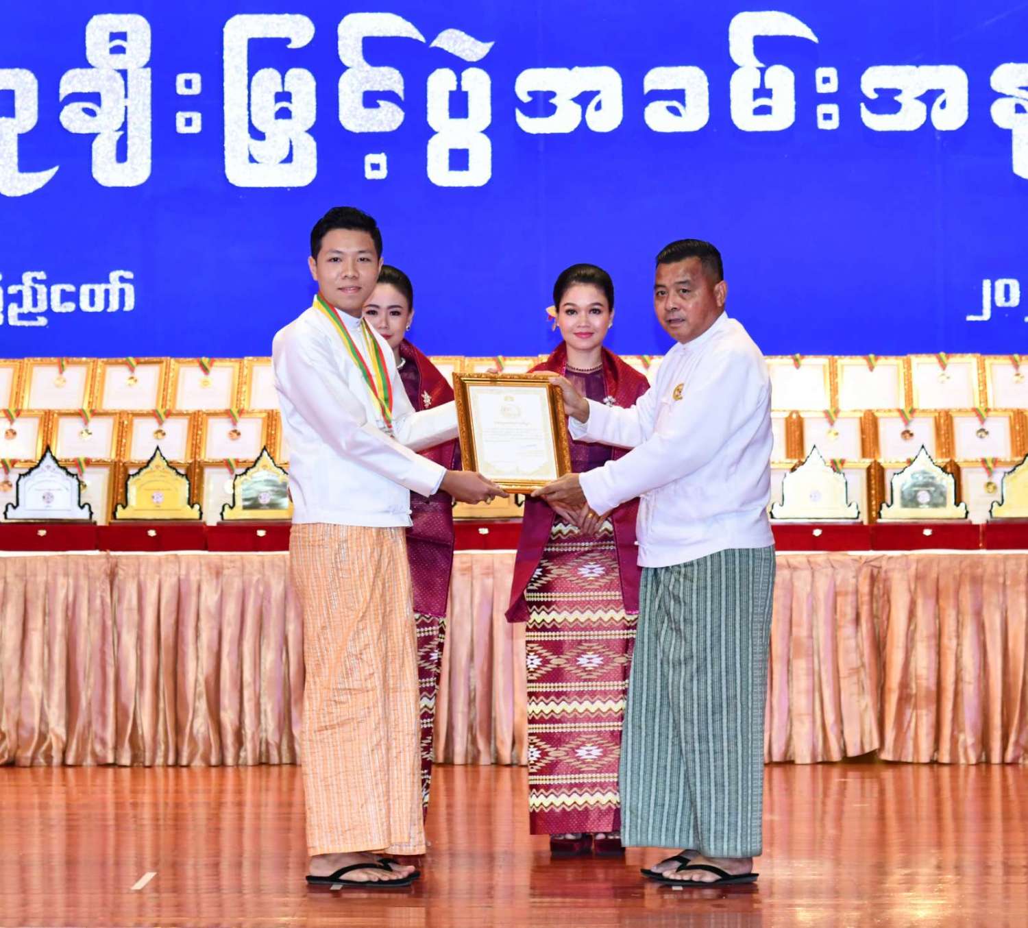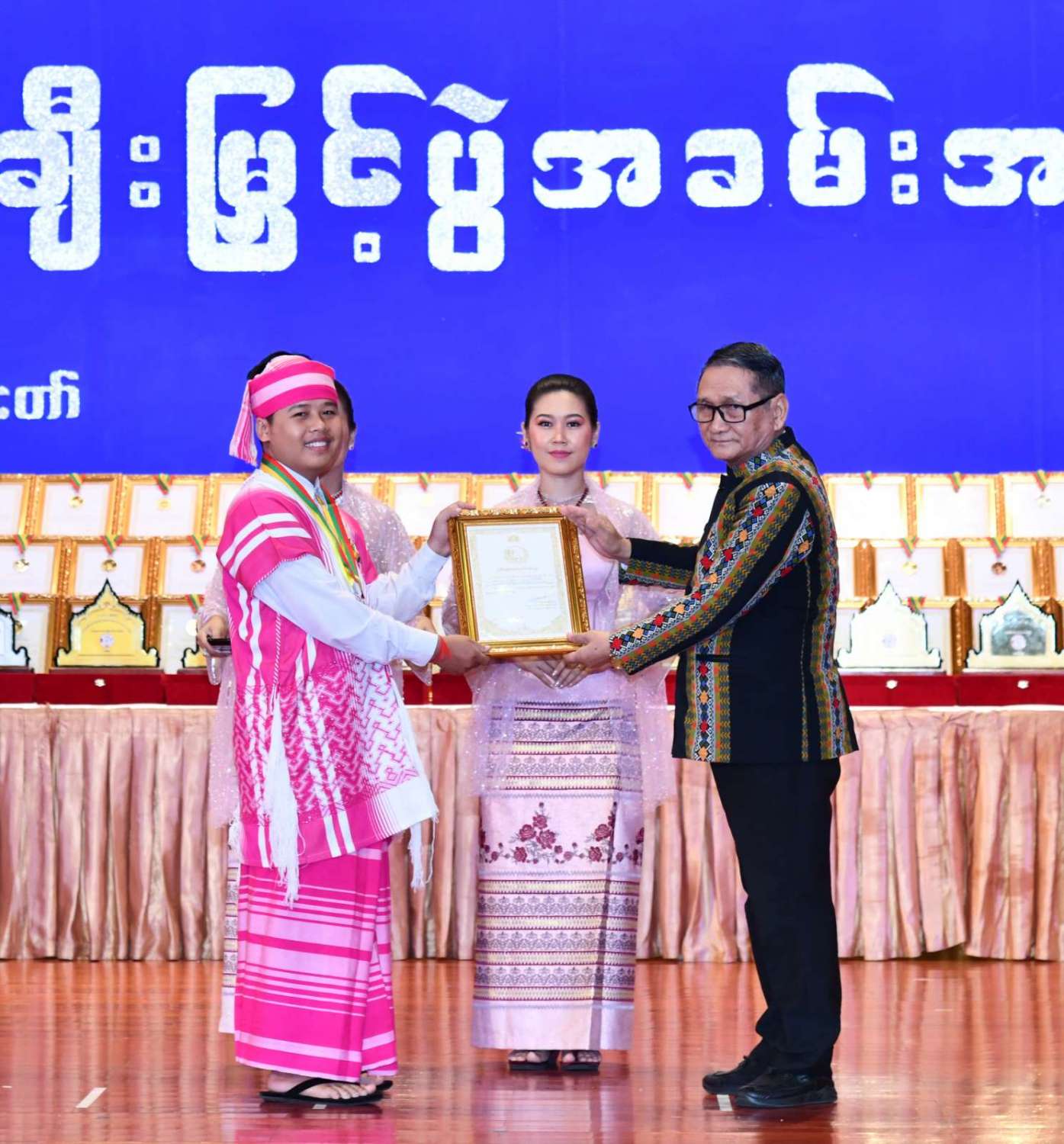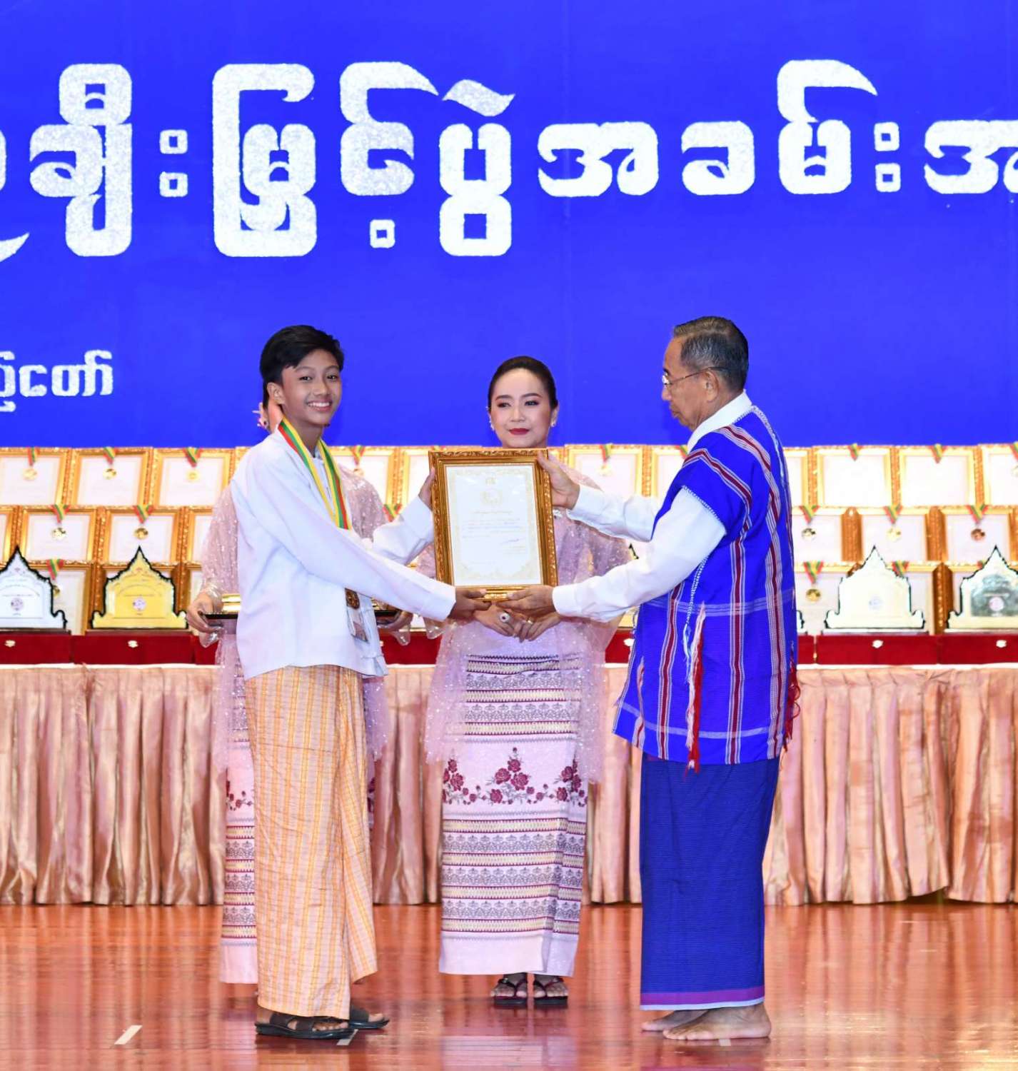 ထို့နောက် ဆုများပေးအပ်ချီးမြှင့်ရာ နိုင်ငံတော်စီမံအုပ်ချုပ်ရေးကောင်စီဥက္ကဋ္ဌ နိုင်ငံတာ်ဝန်ကြီးချုပ်က ကချင်၊ ကယား၊ ကရင်၊ ချင်း၊ မွန်၊ ရခိုင်နှင့် ရှမ်းပြည်နယ်တို့မှ တိုင်းရင်းသားရိုးရာ အကအဖွဲ့များကိုလည်းကောင်း၊ နိုင်ငံတော်စီမံအုပ်ချုပ်ရေးကောင်စီဥက္ကဋ္ဌ နိုင်ငံတာ်ဝန်ကြီးချုပ်၏ ဇနီးက စစ်ကိုင်းတိုင်းဒေသကြီး၊ တနင်္သာရီတိုင်းဒေသကြီး၊ ပဲခူးတိုင်းဒေသကြီး၊ မကွေးတိုင်းဒေသကြီး၊ မန္တလေးတိုင်းဒေသကြီး၊ ရန်ကုန်တိုင်းဒေသကြီးနှင့် ဧရာဝတီတိုင်းဒေသကြီးတို့မှ ကျေးလက်ရိုးရာယဉ်ကျေးမှုအဖွဲ့များကို လည်းကောင်း ဂုဏ်ပြုဆုများ ပေးအပ်ချီးမြှင့်သည်။