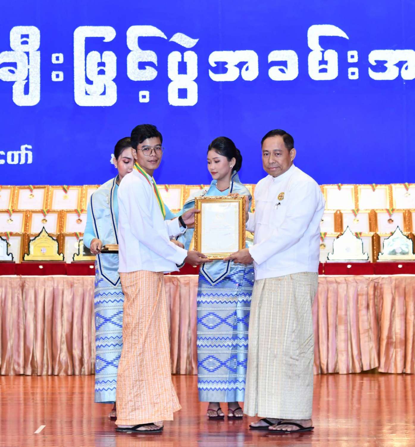 ဆက်လက်၍ အခမ်းအနားဒုတိယပိုင်းအစီအစဉ်ကို ကျင်းပပြုလုပ်ရာ နိုင်ငံတော်စီမံအုပ်ချုပ်ရေးကောင်စီ ဒုတိယဥက္ကဋ္ဌ ဒုတိယဝန်ကြီးချုပ် ဒုတိယဗိုလ်ချုပ်မှူးကြီးစိုးဝင်းက ပြည်နယ်များမှ တိုင်းရင်းသားရိုးရာယဉ်ကျေးမှုအဖွဲ့များကို ဂုဏ်ပြုဆုများကိုလည်းကောင်း၊ နိုင်ငံတော်စီမံအုပ်ချုပ်ရေးကောင်စီ ဒုတိယဥက္ကဋ္ဌ ဒုတိယဝန်ကြီးချုပ်၏ဇနီး ဒေါ်သန်းသန်းနွယ်က မဟာဂီတအဆိုပြိုင်ပွဲ(အမျိုးသမီး)တွင် ဝါသနာရှင်(ပထမတန်း)အဆင့်၌ ပထမဆု၊ ဒုတိယဆုနှင့် တတိယဆုရရှိသူများကို ဂုဏ်ပြုဆုတံဆိပ်နှင့် ဂုဏ်ပြုမှတ်တမ်းလွှာများ ပေးအပ်ချီးမြှင့်သည်။