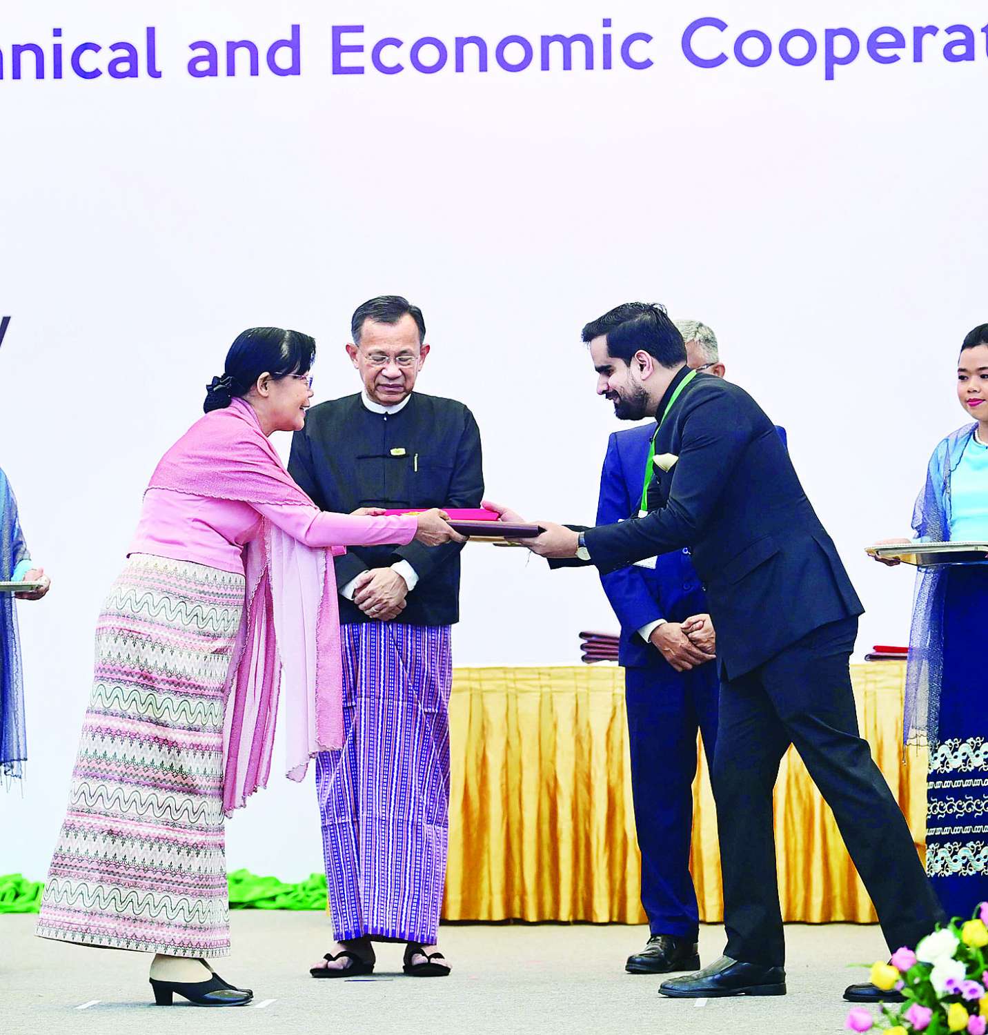 အိန္ဒိယနည်းပညာနှင့် စီးပွားရေးပူးပေါင်းဆောင်ရွက်မှုအစီအစဉ်၏ နှစ် (၆၀) ပြည့် အောင်မြင်မှုကို ဂုဏ်ပြုသည့် ယနေ့အစီအစဉ်မှသည် နောင်လာမည့်နှစ်များတွင် ပိုမိုကြီးမားသော အောင်မြင်မှုများရရှိပါစေကြောင်းကို ဆုမွန်ကောင်းတောင်းအပ်ပါကြောင်း၊ နှစ်နိုင်ငံအပြန်အလှန် လေးစားမှု၊ ပူးပေါင်းဆောင်ရွက်မှုနှင့် တူညီတဲ့မျှော်မှန်းချက်များကိုအခြေပြုပြီး မိမိတို့ နှစ်နိုင်ငံအကြား ချစ်ကြည်ရင်းနှီးသည့်ဆက်ဆံရေးနှင့် အိမ်နီးချင်းကောင်းအဖြစ် ရပ်တည်ဆက်ဆံဆောင်ရွက်ရေးတို့သည် တစ်နှစ်ထက်တစ်နှစ် ပိုမိုတိုးတက်ခိုင်မြဲလာမည်ဟု ယုံကြည်ထားပါကြောင်းဖြင့် ပြောကြားသည်။ ထို့နောက် ပြည်ထောင်စုသမ္မတမြန်မာနိုင်ငံတော်နှင့် အိန္ဒိယနိုင်ငံတို့အကြား မြန်ဆန်စွာအကျိုးဖြစ်ထွန်းစေမည့် (Quick Impact Projects-QIPs) အကောင်အထည်ဖော် ဆောင်ရွက်ရန်နှင့် နားလည်မှုစာချွန်လွှာလဲလှယ်ခြင်းအခမ်းအနားကို ဆက်လက်ကျင်းပပြုလုပ်ရာ ဒီဂျစ်တယ်မှုခင်းသိပ္ပံဓာတ်ခွဲခန်းအဆင့်မြှင့်တင်ရေးစီမံချက်၊ မြန်မာနိုင်ငံ အုပ်ချုပ်ရေးပညာဖွံ့ဖြိုးမှုသင်တန်းကျောင်းအတွက် သင်ကြားရေးအထောက်အကူပြု ပစ္စည်းကိရိယာများထောက်ပံ့ပေးခြင်းစီမံချက်၊ မြန်မာနိုင်ငံအလယ်ပိုင်း၊ အပူပိုင်းဒေသရှိ မိုးခေါင်ရေရှားမှုကြုံတွေ့နေရသည့်ကျေးရွာများ၌ ဆိုလာစွမ်းအင်အသုံးပြု၍ ကျေးလက်ရေထောက်ပံ့ရေးစီမံချက်၊ ရန်ကုန်နည်းပညာတက္ကသိုလ်တွင် အသိဉာဏ်တုဆိုင်ရာ ဓာတ်ခွဲခန်းတည်ဆောက်ခြင်းစီမံချက်၊ မြန်မာ့ကျေးလက်ဒေသ ဖွံ့ဖြိုးတိုးတက်ရေးအတွက် လယ်ယာစိုက်ပျိုးရေးစွန့်ပစ်ပစ္စည်းများဖြင့် နှေးကွေးသော Pyrolysis ပြုလုပ်ပြီး ကတ္တရာကင်းစင်ပြီး ခြောက်သွေ့သောဓာတ်ငွေ့အမျိုးအစား ရေပလတ်စတစ် Pyrolysis ဖြစ်စဉ်များမှရရှိသော လောင်စာများအား ပေါင်းစပ်သုံးစွဲခြင်းဖြစ်စဉ်အား စမ်းသပ်လေ့လာခြင်းစီမံချက် စသည့်နားလည်မှု စာချွန်လွှာများကို မြန်မာနိုင်ငံရှိ သက်ဆိုင်ရာဝန်ကြီးဌာနများမှ တာဝန်ရှိသူများနှင့် အိန္ဒိယနိုင်ငံသံရုံး ဒုတိယအကြီးအကဲတို့က ရင်းနှီးမြှုပ်နှံမှုနှင့် နိုင်ငံခြားစီးပွားဆက်သွယ်ရေးဝန်ကြီးဌာန ပြည်ထောင်စုဝန်ကြီး ဒေါက်တာကံဇော်နှင့် မြန်မာနိုင်ငံဆိုင်ရာ အိန္ဒိယနိုင်ငံသံအမတ်ကြီး H.E. Mr. Abhay Thakur တို့အား သက်သေထား၍ နိုင်ငံတော်စီမံအုပ်ချုပ်ရေးကောင်စီဥက္ကဋ္ဌ နိုင်ငံတော်ဝန်ကြီးချုပ် ရှေ့မှောက်တွင်လဲလှယ်ကြသည်။