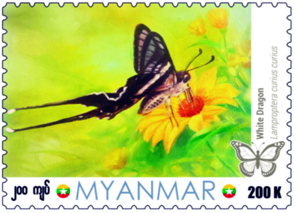 ပို့ဆောင်ရေးနှင့်ဆက်သွယ်ရေးဝန်ကြီးဌာန မြန်မာ့စာတိုက်လုပ်ငန်းမှ သယံဇာတနှင့် သဘာဝပတ်ဝန်းကျင်ထိန်းသိမ်းရေးဝန်ကြီးဌာနက မြန်မာနိုင်ငံ၌ တွေ့ရှိရသော လိပ်ပြာမျိုးစိတ်အဖြစ် မှတ်တမ်းတင်သဘောထားမှတ်ချက်ပြုထားသည့် “White Dragon” လိပ်ပြာပုံ (၂၀၀ ကျပ်တန်) စာပို့တံဆိပ်ခေါင်းသစ်တစ်မျိုးကို ၂၀၂၄ ခုနှစ် နိုဝင်ဘာ ၁၁ ရက် မြန်မာသက္ကရာဇ် ၁၃၈၆ ခုနှစ် တန်ဆောင်မုန်းလဆန်း ၁၁ ရက် (တနင်္လာနေ့) နံနက် ၉ နာရီခွဲမှ စတင်၍ နေပြည်တော်ဗဟို စာတိုက်ကြီး၊ ရန်ကုန်စာတိုက်ကြီး၊ မန္တလေးစာတိုက်ကြီးတို့နှင့် တိုင်းဒေသကြီး/ ပြည်နယ်များရှိ စာတိုက်ကြီးများတွင် တစ်ပြိုင်တည်း ရောင်းချပေးသွားမည်ဖြစ်သည်။