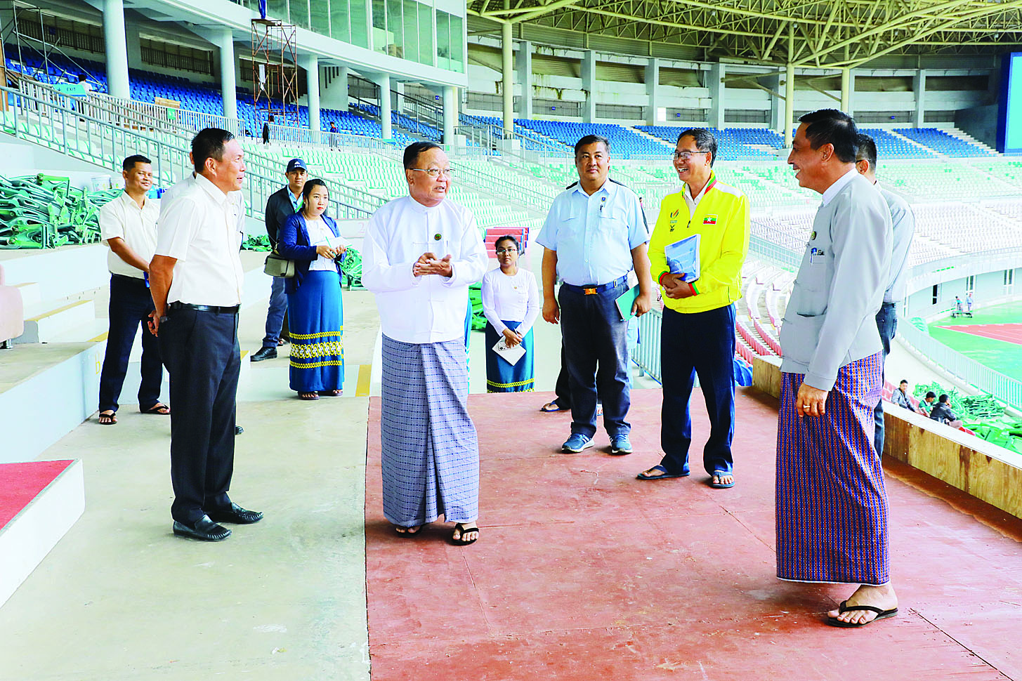 ဦးစွာ ဒုတိယဝန်ကြီးနှင့်အဖွဲ့သည် ဖွင့်ပွဲ/ပိတ်ပွဲအခမ်းအနားတွင် နိုင်ငံတော်အကြီးအကဲများ တက်ရောက်ကြည့်ရှုအားပေးမည့် နေရာထိုင်ခင်းများ ကြိုတင်ပြင်ဆင်ဆောင်ရွက်ထားရှိမှု အခြေအနေများ၊ အားကစားပွဲတော်ကာလအတွင်း လျှပ်စစ်မီးများ မပြတ်တောက်စေရေးအတွက် အရန်မီးစက်များ ကြိုတင်ပြင်ဆင် ဆောင်ရွက်ထားရှိမှုအခြေအနေ၊ အားကစားလေ့ကျင့်ရေးစခန်း (Gold Camp) Cluster-4 ရှိ ဒိုင်/ဂျူရီများ တည်းခိုနေထိုင်မည့် အိပ်ဆောင်များ ပြုပြင်မွမ်းမံ ဆောင်ရွက်နေမှု အခြေအနေများကို လိုက်လံကြည့်ရှုစစ်ဆေးပြီး ၂၀၂၄ ခုနှစ် ပဉ္စမအကြိမ် အမျိုးသား အားကစားပွဲတော် ဖွင့်ပွဲ/ ပိတ်ပွဲအခမ်းအနားကို ခမ်းခမ်းနားနားဖြင့် အောင်မြင်စွာကျင်းပနိုင်ရေး၊ အခမ်းအနားပြင်ဆင်ရာတွင် လစ်ဟင်းမှုများ၊ လိုအပ်ချက်များမရှိစေရေးအတွက် တာဝန်ရှိသူများက ဂရုတစိုက်စစ်ဆေး ကြပ်မတ်သွားရန်လိုကြောင်း၊ နိုင်ငံတော်အလံနှင့် အမျိုးသား အားကစားပွဲတော်အလံ လွှင့်တင်မည့် အလံစင်ခိုင်ခံ့မှုရှိစေရေး ဆောင်ရွက်သွားရန်၊ ဖွင့်ပွဲ/ ပိတ်ပွဲ အခမ်းအနားတွင် နိုင်ငံတော်အကြီးအကဲများ တက်ရောက်ကြည့်ရှုအားပေးမည့် နေရာထိုင်ခင်းများ ခိုင်ခံ့မှုရှိစေရေးနှင့် စနစ်တကျ သန့်ရှင်းသပ်ရပ်မှုရှိစေရေး ဆောင်ရွက်သွားရန်၊ အားကစားပွဲတော် ကာလအတွင်း ဒိုင်/ဂျူရီများ တည်းခိုနေထိုင်မည့် အိပ်ဆောင်များ သန့်ရှင်းသပ်ရပ်မှု ရှိစေရေးအတွက် လိုအပ်သည်များကို ဝိုင်းဝန်းပူးပေါင်း၍ ကြိုတင်ပြင်ဆင် ဆောင်ရွက်သွားရန်နှင့် လိုအပ်ချက်များရှိပါက အချိန်နှင့်တစ်ပြေးညီ တင်ပြဆောင်ရွက်သွားရန် မှာကြားခဲ့ကြောင်း သိရသည်။