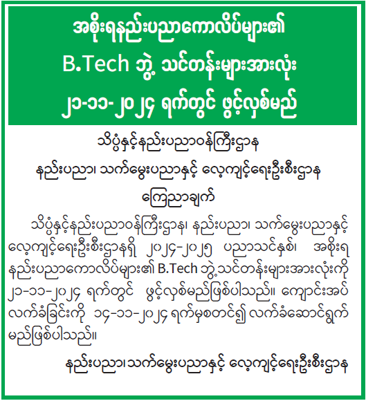 အစိုးရနည်းပညာကောလိပ်များ၏ B.Tech ဘွဲ့ သင်တန်းများအားလုံး ၂၁-၁၁-၂၀၂၄ ရက်တွင် ဖွင့်လှစ်မည်