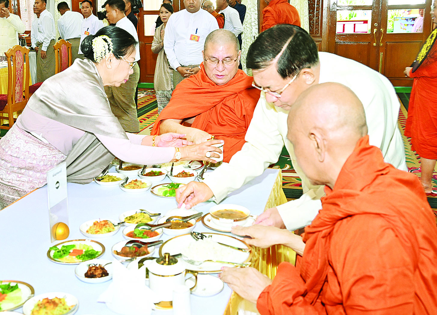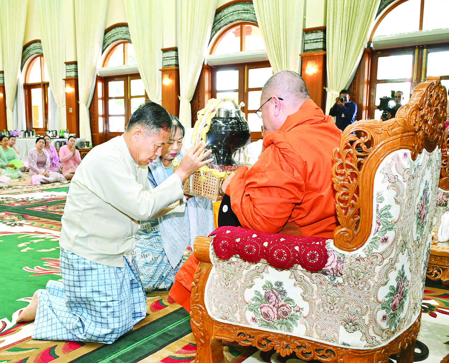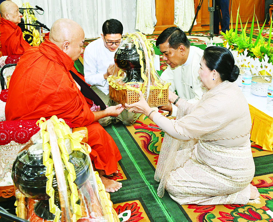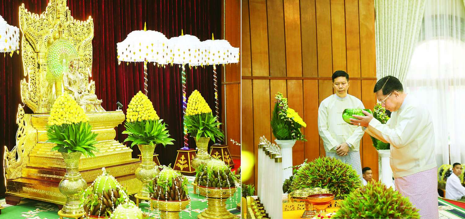 ဦးစွာ နိုင်ငံတော်စီမံအုပ်ချုပ်ရေးကောင်စီဥက္ကဋ္ဌ တပ်မတော်ကာကွယ်ရေးဦးစီးချုပ်၊ ဇနီးနှင့် ဧည့်ပရိသတ်များသည် ဘုန်းတော်ကြီးကျောင်းအသီးသီးသို့ လှူဒါန်းရန် ခင်းကျင်းပြင်ဆင်ထားသည့် ကထိန်လျာသင်္ကန်း၊ လှူဖွယ်ပစ္စည်းများနှင့် ပဒေသာပင်များအား လှည့်လည်ကြည့်ရှုကြသည်။ ထို့နောက် နိုင်ငံတော်စီမံအုပ်ချုပ်ရေးကောင်စီဥက္ကဋ္ဌ တပ်မတော်ကာကွယ်ရေးဦးစီးချုပ်သည် အနော်ရထာခန်းမအတွင်းရှိ ဗုဒ္ဓရုပ်ပွားတော်မြတ်အား ဖူးမြော်ကြည်ညို၍ မြသပိတ်ဆွမ်းတော်နှင့် ပန်း၊ သောက်တော်ရေချမ်း၊ ဆီမီး၊ သစ်သီးတို့ကို ဆက်ကပ်လှူဒါန်းသည်။