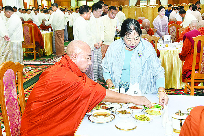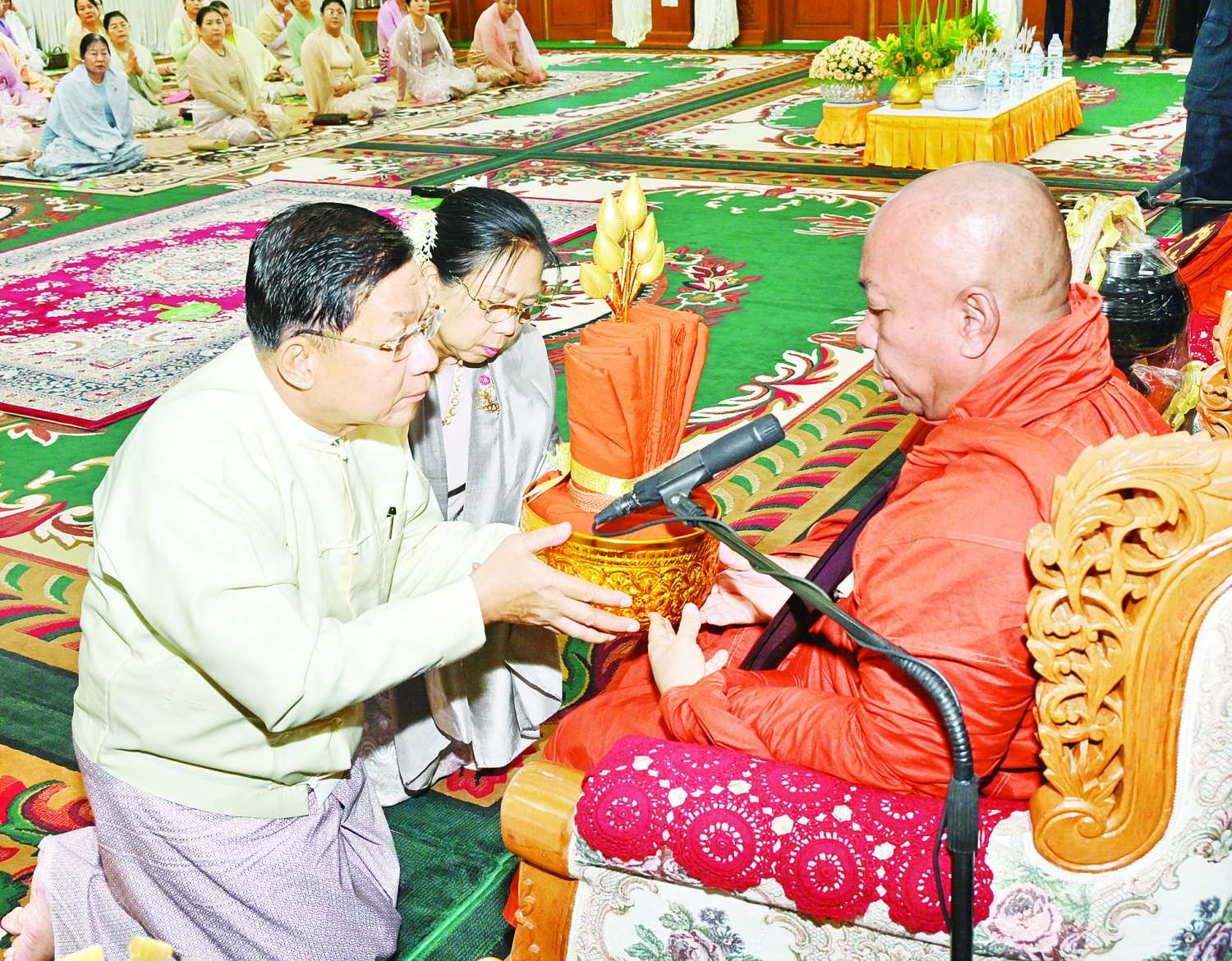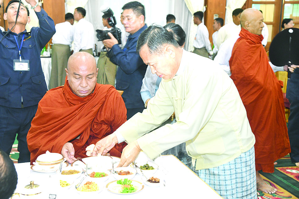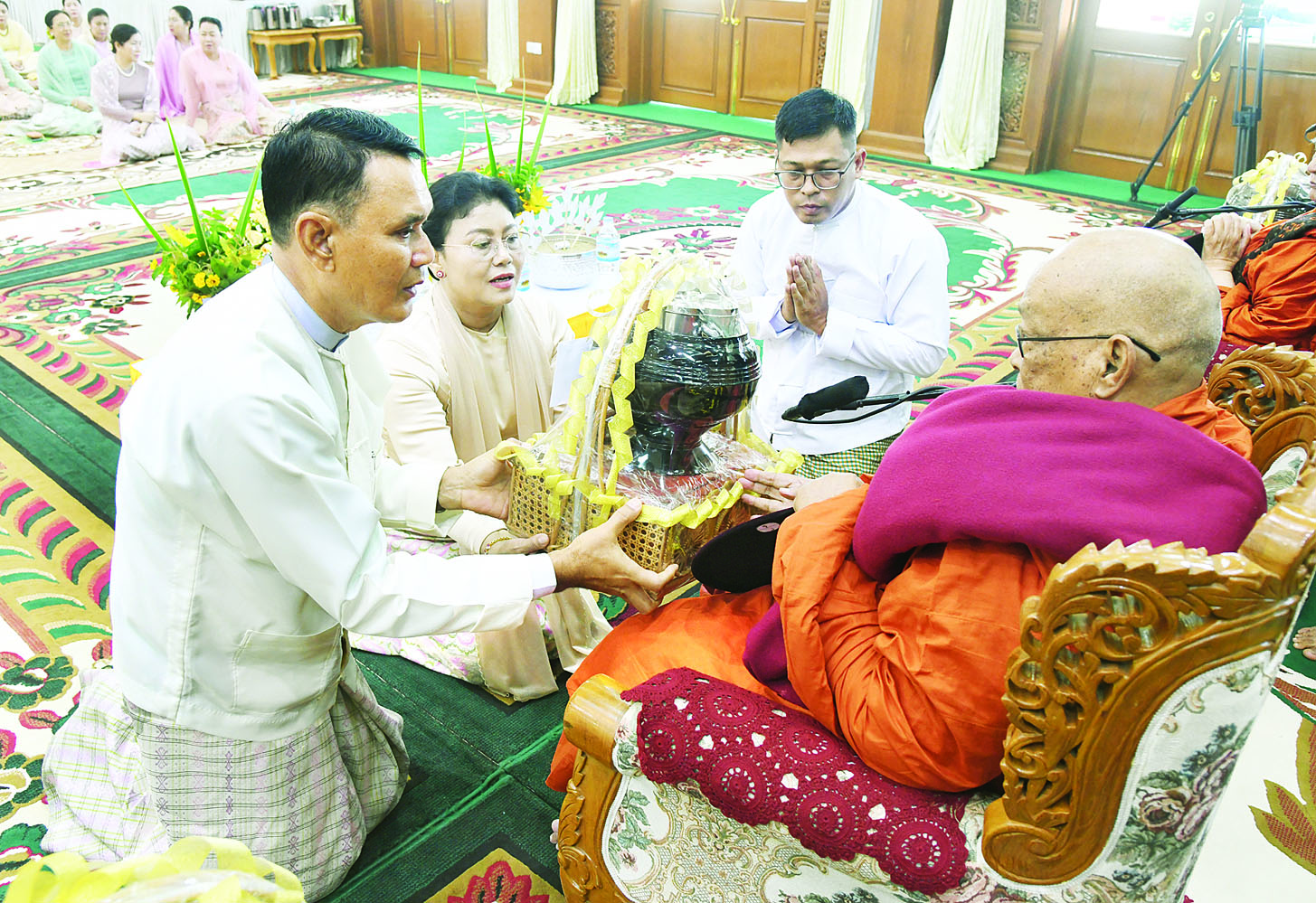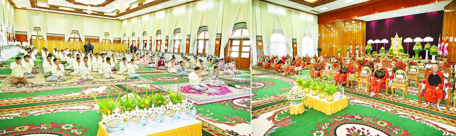 ဦးစွာ နိုင်ငံတော်စီမံအုပ်ချုပ်ရေးကောင်စီဥက္ကဋ္ဌ တပ်မတော်ကာကွယ်ရေးဦးစီးချုပ်၊ ဇနီးနှင့် ဧည့်ပရိသတ်များသည် ဘုန်းတော်ကြီးကျောင်းအသီးသီးသို့ လှူဒါန်းရန် ခင်းကျင်းပြင်ဆင်ထားသည့် ကထိန်လျာသင်္ကန်း၊ လှူဖွယ်ပစ္စည်းများနှင့် ပဒေသာပင်များအား လှည့်လည်ကြည့်ရှုကြသည်။ ထို့နောက် နိုင်ငံတော်စီမံအုပ်ချုပ်ရေးကောင်စီဥက္ကဋ္ဌ တပ်မတော်ကာကွယ်ရေးဦးစီးချုပ်သည် အနော်ရထာခန်းမအတွင်းရှိ ဗုဒ္ဓရုပ်ပွားတော်မြတ်အား ဖူးမြော်ကြည်ညို၍ မြသပိတ်ဆွမ်းတော်နှင့် ပန်း၊ သောက်တော်ရေချမ်း၊ ဆီမီး၊ သစ်သီးတို့ကို ဆက်ကပ်လှူဒါန်းသည်။