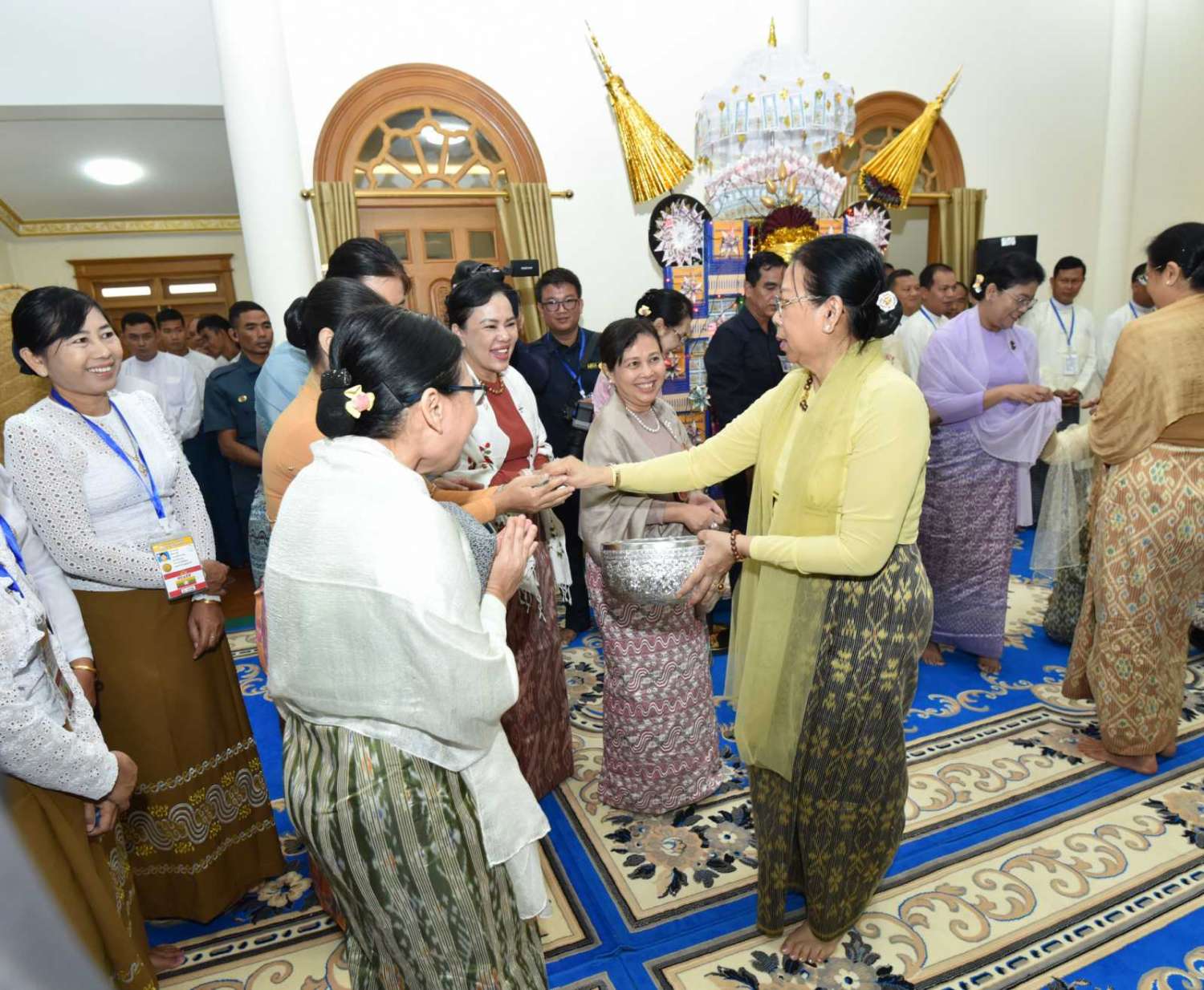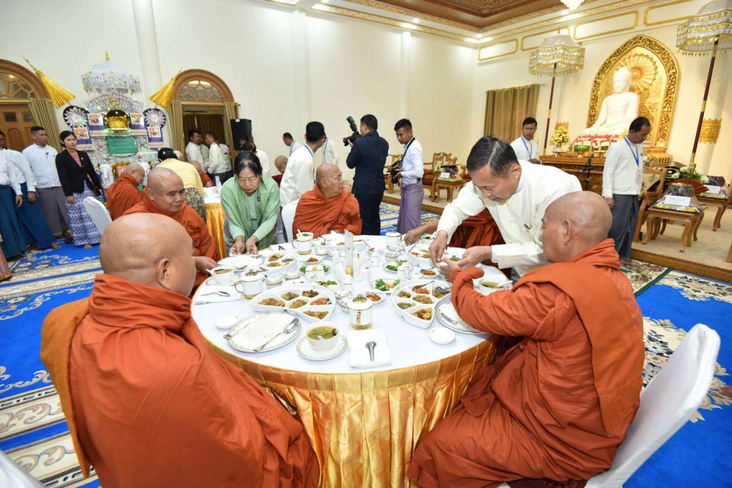 အခမ်းအနားသို့ လယ်ဝေးမြို့၊ ပေါက်မြိုင်ကျောင်းတိုက် ပဓာနနာယက အဘိဓဇ မဟာရဋ္ဌဂုရု ဘဒ္ဒန္တဇနိန္ဒ အမှူးပြုသည့် ဆရာတော်ကြီးများနှင့် မာရဝိဇယကျောင်းတော်တွင် သီတင်းသုံးတော်မူကြသည့် ဆရာတော်ကြီးများ ကြွရောက်ချီးမြှင့်တော်မူကြပြီး နိုင်ငံတော်စီမံအုပ်ချုပ်ရေးကောင်စီဥက္ကဋ္ဌ နိုင်ငံတော်ဝန်ကြီးချုပ် ဗိုလ်ချုပ်မှူးကြီး မင်းအောင်လှိုင်နှင့်ဇနီး ဒေါ်ကြူကြူလှတို့နှင့်အတူ နိုင်ငံတော်စီမံအုပ်ချုပ်ရေးကောင်စီ ဒုတိယဥက္ကဋ္ဌ၊ ဒုတိယဝန်ကြီးချုပ် ဒုတိယဗိုလ်ချုပ်မှူးကြီး စိုးဝင်းနှင့်ဇနီး ဒေါ်သန်းသန်းနွယ်၊ ကောင်စီအတွင်းရေးမှူးနှင့်ဇနီး၊ တွဲဖက်အတွင်းရေးမှူးနှင့်ဇနီး၊ ကောင်စီဝင်များနှင့်ဇနီးများ၊ ပြည်ထောင်စုဝန်ကြီးများနှင့် ဇနီးများ၊ နေပြည်တော်ကောင်စီဥက္ကဋ္ဌ၊ ကာကွယ်ရေးဦးစီးချုပ်ရုံးမှ အဆင့်မြင့်တပ်မတော်အရာရှိကြီးများနှင့်ဇနီးများ၊ နေပြည်တော်တိုင်းစစ်ဌာနချုပ်တိုင်းမှူးနှင့် တာဝန်ရှိသူများ တက်ရောက်ကြသည်။