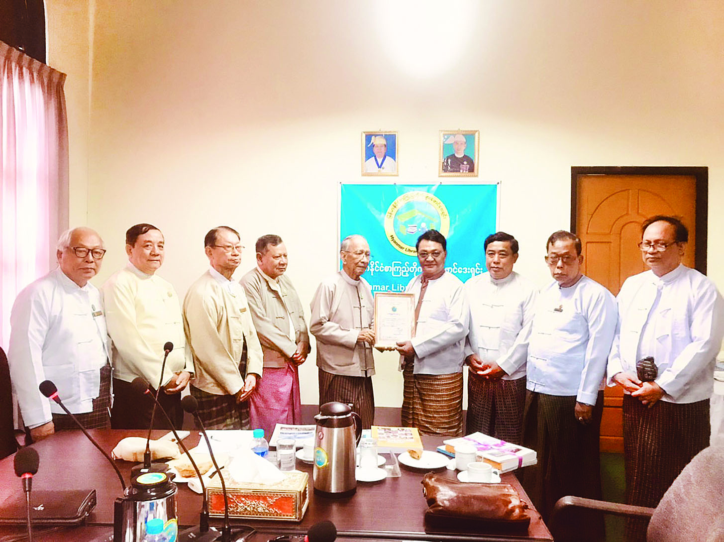 ထို့နောက် သတင်းမီဒီယာကောင်စီဥက္ကဋ္ဌ ဦးအုန်းမောင် (မြင်းမူမောင်နိုင်မိုး) က စာအုပ်များလှူဒါန်းရခြင်းရည်ရွယ်ချက်ကို ရှင်းလင်းပြောကြားပြီး စာအုပ်များပေးအပ်လှူဒါန်းရာ မြန်မာနိုင်ငံ စာကြည့်တိုက်များဖောင်ဒေးရှင်းဥက္ကဋ္ဌ ဦးညွန့်ဆွေကလက်ခံရယူပြီး ကျေးဇူးတင်စကားပြောကြား၍ ဂုဏ်ပြုမှတ်တမ်းလွှာ ပြန်လည်ပေးအပ်သည်။
