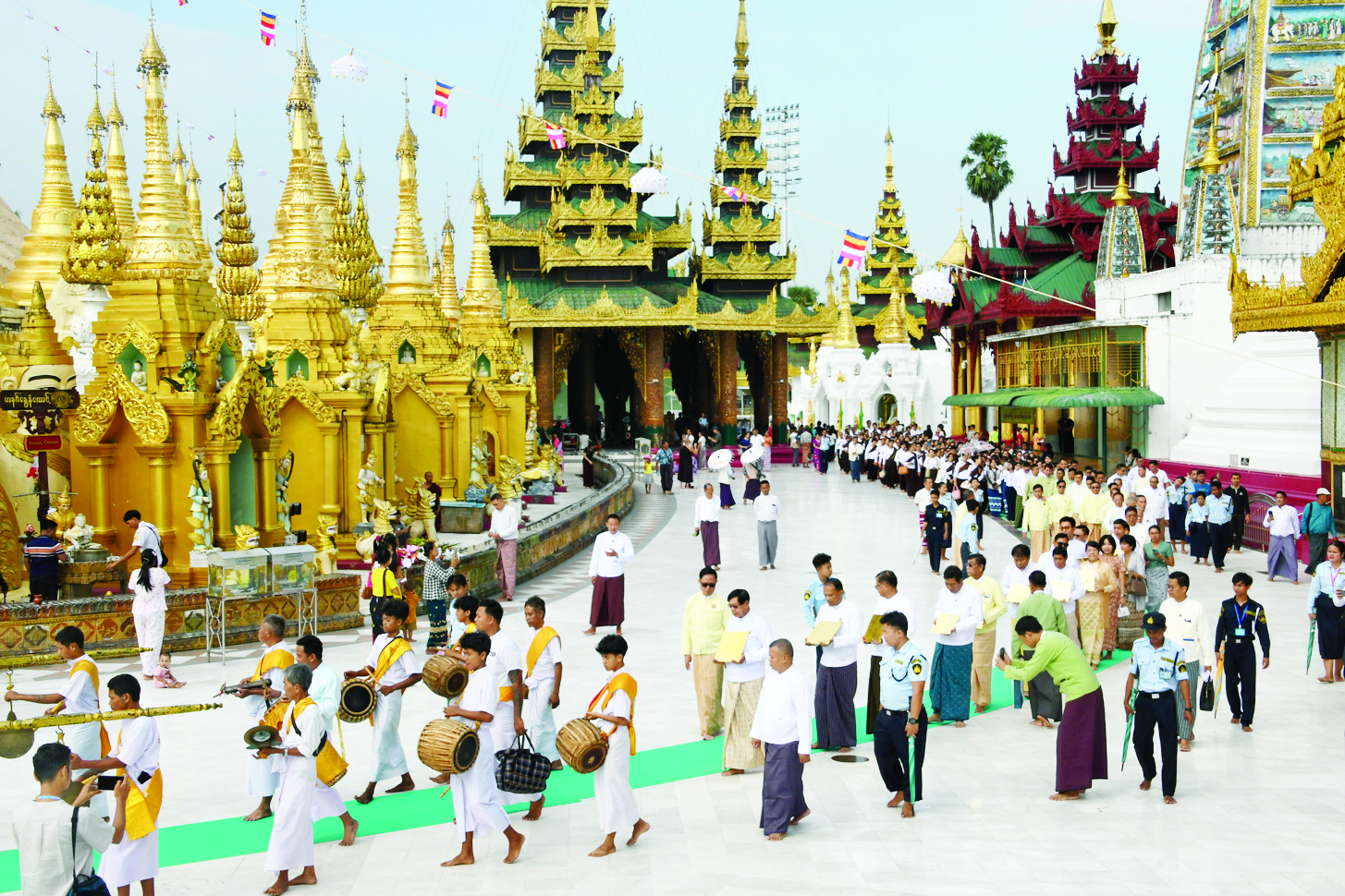 ရွှေတိဂုံစေတီတော်မြတ်ကြီးအား လုံးတော်ပြည့်ရွှေစင်ရွှေပြားသင်္ကန်းတော်များ စတင်ကပ်လှူပူဇော်ခြင်းနှင့် ရွှေပြားသင်္ကန်းတော်များ လှည့်လည်ပူဇော်ပွဲကို ယနေ့နံနက်ပိုင်းတွင် စေတီတော်ရင်ပြင်ရှိ သတ်မှတ်နေရာများ၌ ကျင်းပသည်။