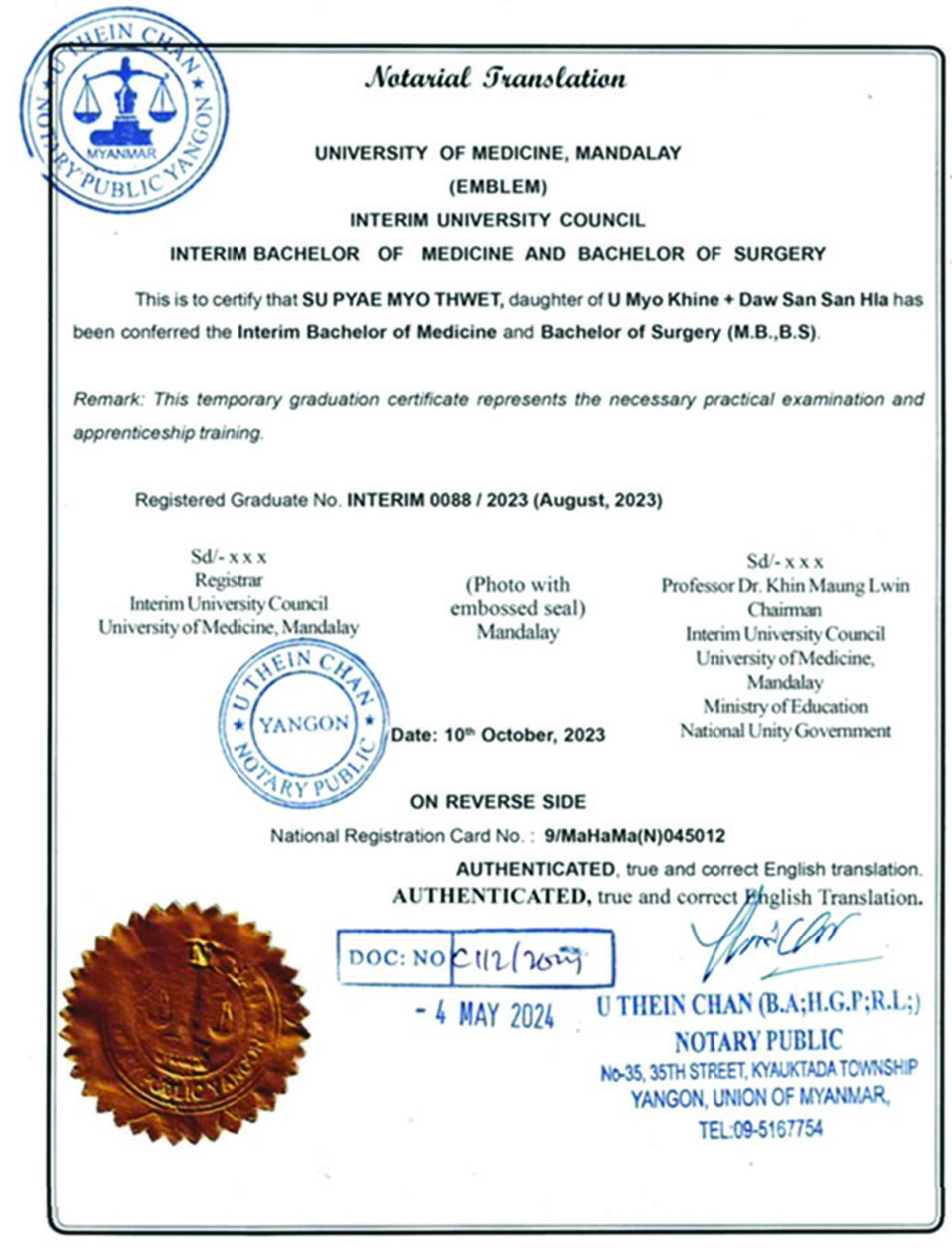 အကြမ်းဖက်အုပ်စုအဖြစ် ကြေညာထားသော NUG အဖွဲ့လက်အောက်ခံ တရားမဝင်ဆေးတက္ကသိုလ်(မန္တလေး)၊ ယာယီတက္ကသိုလ်ကောင်စီမှထုတ်ပေးခဲ့သည့် ယာယီဆေးပညာဘွဲ့ လက်မှတ်အတုတို့အား Notary(သက်သေခံချက်) ပြုလုပ်ပေးခဲ့သည့် ဖမ်းဆီးရမိတရားခံသိဏ်းချမ်း(ခ)သိန်းဝင်း၊ သက်ထက်ဦး(ခ)ဝင်းထက်မြတ်နှင့် မြတ်မင်းသူတို့ ၃ ဦးနှင့်အတူ ပါဝင်ပတ်သက်သူများအား ထိရောက်စွာအရေးယူဆောင်ရွက်သွားမည်ဖြစ်ပါသည်။