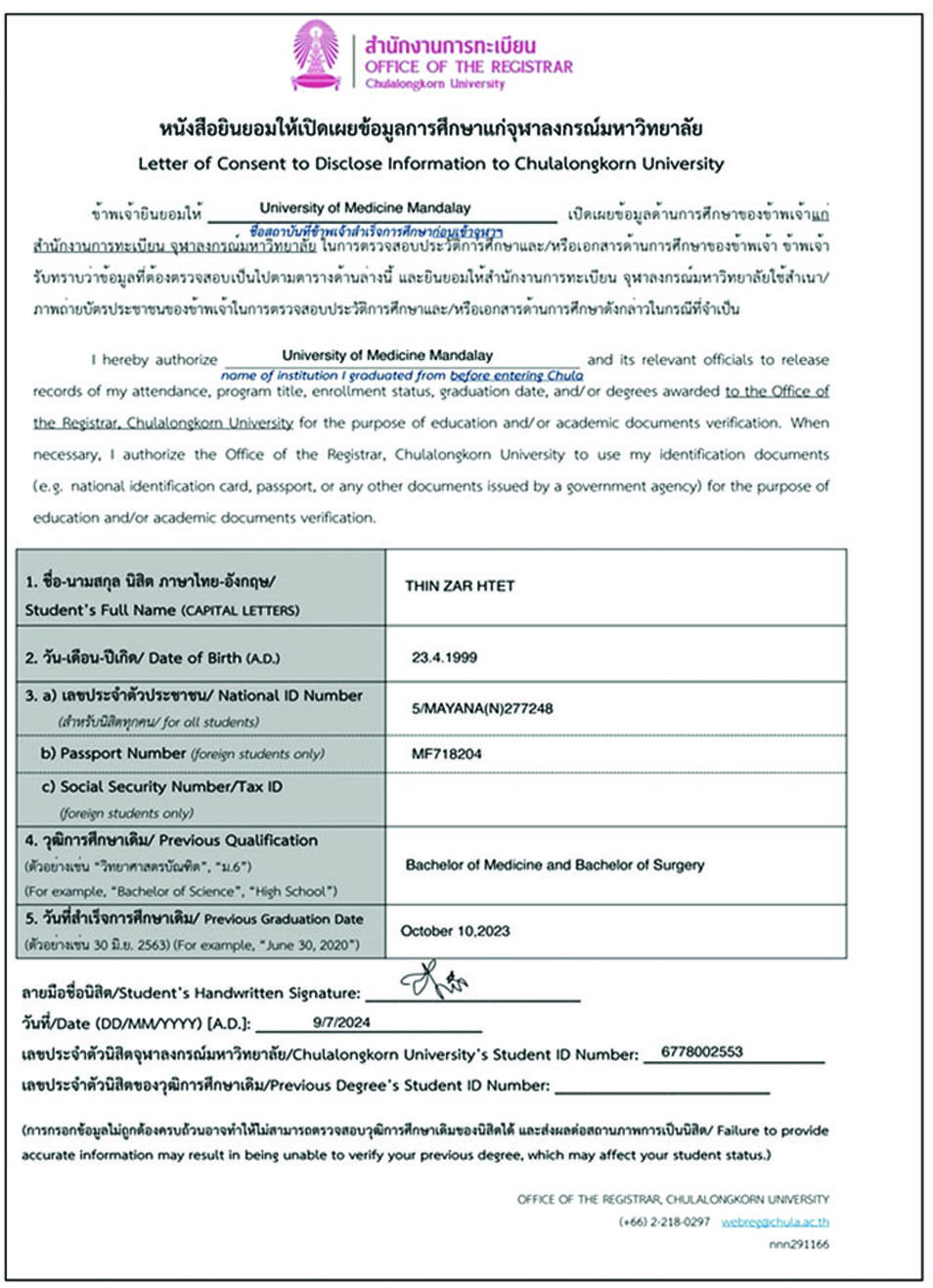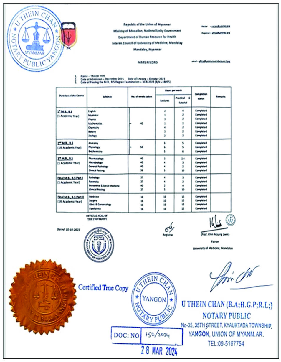 ၎င်းတို့ ၂ ဦးသည် အကြမ်းဖက်အုပ်စုအဖြစ်ကြေညာထားသော NUG အဖွဲ့ လက်အောက်ခံ တရားမဝင်ဆေးတက္ကသိုလ် (မန္တလေး)၊ ယာယီတက္ကသိုလ်ကောင်စီနာယက သစ္စာမဲ့ဝန်ထမ်း (Disloyalty Civil Servant-DCS) ဖြစ်သူခင်မောင်လွင် (ဆေးတက္ကသိုလ်-မန္တလေး၊ ပါမောက္ခချုပ်ဟောင်း)မှ တရားမဝင်ထုတ်ပေးခဲ့သည့် ယာယီဆေးပညာဘွဲ့လက်မှတ်အတုတို့ဖြင့် ထိုင်းနိုင်ငံ၊ Chulalongkom တက္ကသိုလ်သို့ တက်ရောက်ခွင့်ရရှိရေးအတွက် တရားမဝင်လျှောက်ထားခဲ့ကြောင်းသိရှိရသည်။ ၂၀၂၄ ခုနှစ်၊ နိုဝင်ဘာလ ၁၉ ရက်တွင် ထိုင်းနိုင်ငံ၊ Chulalongkorn တက္ကသိုလ်မှ အဆိုပါကျောင်းသူ ၂ ဦး၏ တက္ကသိုလ်တက်ရောက်ခွင့် လျှောက်ထားမှုနှင့်ပတ်သက်၍ သံသယရှိသဖြင့် ယာယီဆေးပညာဘွဲ့လက်မှတ်များအား အတည်ပြုပေးနိုင်ရန် မြန်မာနိုင်ငံရှိဆေးတက္ကသိုလ် (မန္တလေး)သို့ အကြောင်းကြားလာခဲ့ကြောင်း သိရှိရသည်။