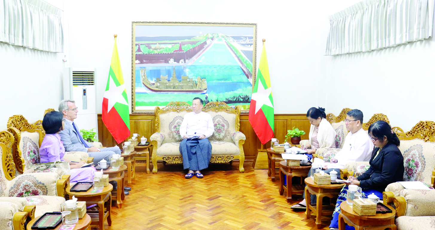 ရင်းနှီးမြှုပ်နှံမှုနှင့် နိုင်ငံခြားစီးပွားဆက်သွယ်ရေးဝန်ကြီးဌာန ပြည်ထောင်စုဝန်ကြီး ဒေါက်တာကံဇော်သည် ကမ္ဘာ့စားနပ်ရိက္ခာအစီအစဉ် (WFP)၏ မြန်မာနိုင်ငံဆိုင်ရာ ဌာနေကိုယ်စားလှယ် အသစ် Mr. Michael John Dunford ကိုယနေ့ မွန်းလွဲပိုင်းတွင် နေပြည်တော်ရှိ ရင်းနှီးမြှုပ်နှံမှုနှင့်နိုင်ငံခြား စီးပွားဆက်သွယ်ရေးဝန်ကြီးဌာန၌ လက်ခံတွေ့ဆုံသည်။