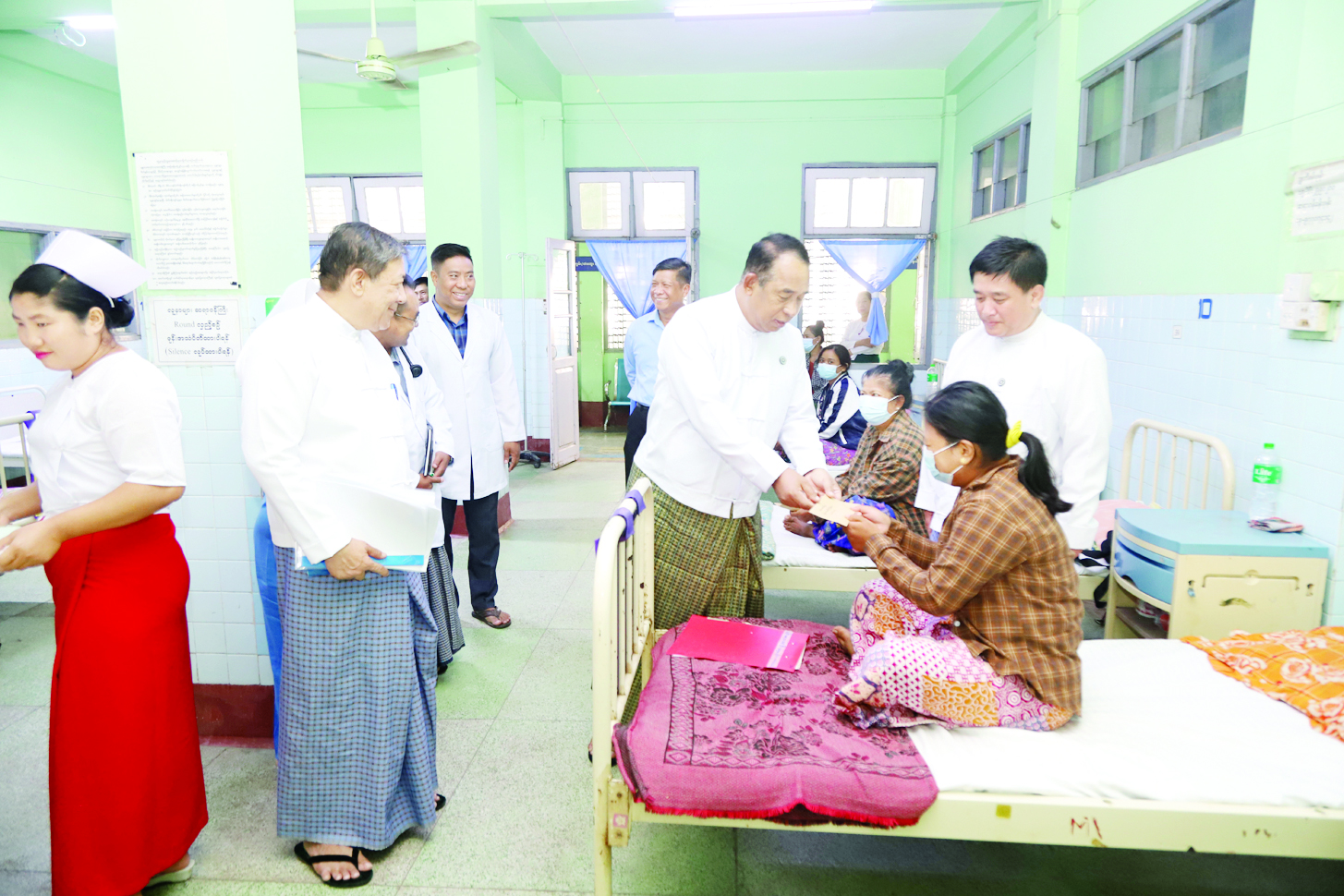 ယင်းနောက် အလုပ်သမားဆေးရုံကြီးအတွင်း ပြင်ပလူနာဌာန၌ လာရောက်ပြသသည့် ပြင်ပလူနာများအား ဆေးဝါးကုသပေးနေမှုအခြေအနေများ၊ အတွင်းလူနာအဖြစ်ကုသပေးသည့် ကုသဆောင်များ၊ ကျောက်ကပ်သန့်စင်ဆေးကြောနေသည့် လူနာဆောင်သို့သွားရောက်၍ ဆေးဝါးကုသမှု ခံယူနေသည့် အာမခံအလုပ်သမားများကို ရင်းရင်းနှီးနှီးတွေ့ဆုံအားပေးကာ ထောက်ပံ့ငွေများပေးအပ်သည်။