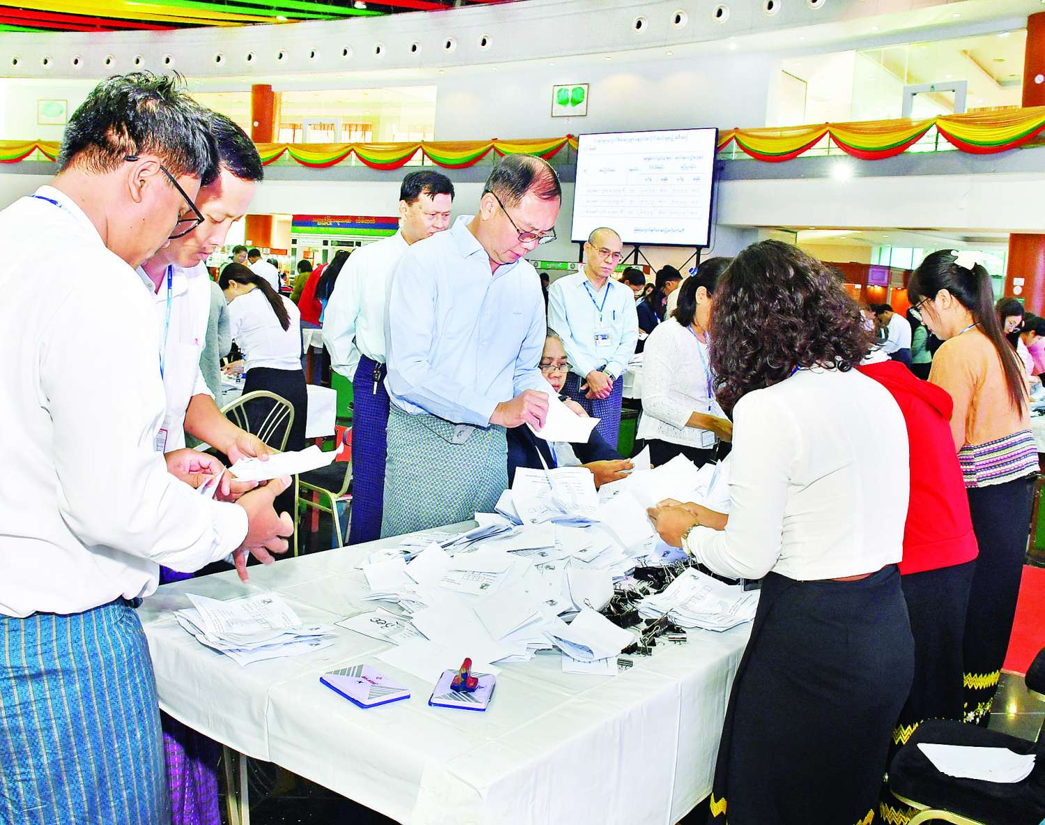 ညနေပိုင်းတွင် မြန်မာ့ကျောက်မျက်ရတနာပြပွဲ ဗဟိုကော်မတီနာယက သယံဇာတနှင့် သဘာဝပတ်ဝန်းကျင်ထိန်းသိမ်းရေးဝန်ကြီးဌာန ပြည်ထောင်စုဝန်ကြီး ဦးခင်မောင်ရီသည် ပြပွဲကျင်းပရာမဏိရတနာကျောက်စိမ်းခန်းမအပြင်ဘက် သတ်မှတ်နေရာများအလိုက် ခင်းကျင်းပြသထားသည့် အိတ်ဖွင့်တင်ဒါစနစ်ဖြင့် ရောင်းချမည့်အုပ်စု(စီ)မှ ကျောက်စိမ်းအတွဲများအား ရတနာကုန်သည်များက ကြည့်ရှုစစ်ဆေးနေမှုနှင့် ကျောက်စိမ်းအတွဲများအတွက် ဈေးနှုန်းတင်သွင်းလွှာများ ဖွင့်ဖောက်စစ်ဆေးနေမှုကို ကြည့်ရှုစစ်ဆေးပြီး တာဝန်ရှိသူများအား လိုအပ်သည်များ မှာကြားသည်။