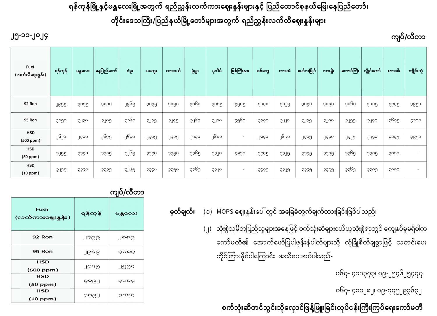 ရန်ကုန်မြို့နှင့် မန္တလေးမြို့အတွက် ရည်ညွှန်းလက်ကားဈေးနှုန်းများနှင့် ပြည်ထောင်စုနယ်မြေ နေပြည်တော်၊ တိုင်းဒေသကြီး/ပြည်နယ် မြို့တော်များအတွက် ရည်ညွှန်းလက်လီဈေးနှုန်းများ 11/25/2024