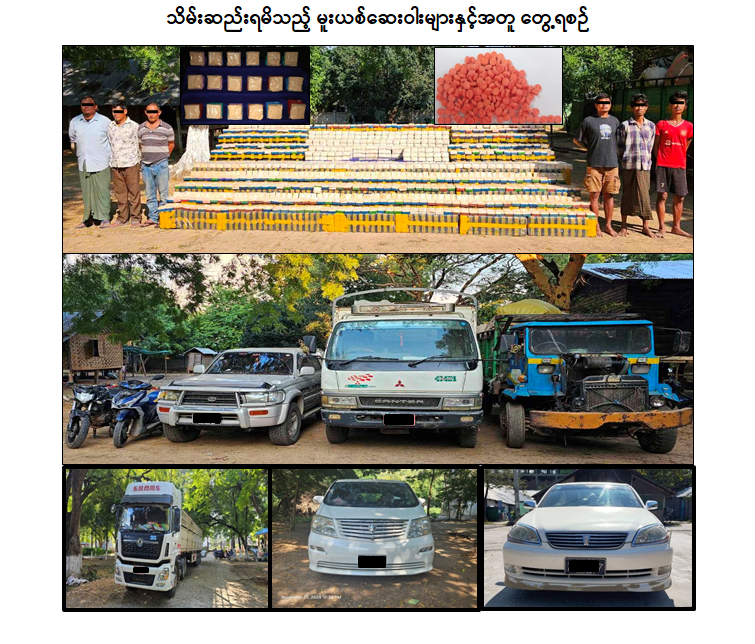 မူးယစ်ဆေးဝါးတားဆီးနှိမ်နင်းရေးရဲတပ်ဖွဲ့မှ တပ်ဖွဲ့ဝင်များပါဝင်သော ပူးပေါင်းအဖွဲ့သည် နိုဝင်ဘာလ ၁၇ ရက်နေ့ ညနေ ၃ နာရီအချိန်၌ မန္တလေးတိုင်းဒေသကြီး၊ ကျောက်ဆည်မြို့နယ်၊ တောင်တော်ကျေးရွာ၏ မြောက်ဘက် ၃ ဖာလုံခန့်အကွာ မြောင်းဘေးတွင် မူးယစ်ဆေးဝါးများ လွှဲပြောင်းသယ်ဆောင်မည်ဖြစ်ကြောင်း သတင်းအရ သွားရောက်ရှာဖွေစစ်ဆေးခဲ့ရာ စိုင်းဝဏ္ဏထွန်း (ခ) ဝဏ္ဏနှင့် စိုးမြင့်ထွန်းတို့ ၂ ဦးအား တူးကရောင်းမော်တော်ယာဉ်တစ်စီး၊ CANTER မော်တော်ယာဉ်တစ်စီး၊ မော်တော်ဆိုင်ကယ်တစ်စီးတို့နှင့်အတူ ဘိန်းဖြူပါ ဆပ်ပြာခွက် ၂၂၀ ခွက်စီပါ ဆာလာအိတ် ၆၇ အိတ်အတွင်းမှ ဘိန်းဖြူ ၁၄၇ ဒသမ ၄ ကီလိုနှင့် ဆာလာအိတ် ၂၀ အိတ်ဖြင့်ထည့်လျက် စိတ်ကြွရူးသွပ်ဆေးပြား ၄၁ ဒသမ ၄၈ သိန်း ဖမ်းဆီးရမိခဲ့ကြောင်း၊ စစ်ဆေးဖော်ထုတ်ချက်အရ ယင်းနေ့ ညနေပိုင်းတွင် မူးယစ်ဆေးဝါးများ သယ်ဆောင်ရာလမ်းကြောင်း၌ ရှေ့ပြေးဆောင်ရွက်သူ ဉာဏ်ဝင်းလှိုင်အား စဉ့်ကိုင်မြို့ တိုးဂိတ်တွင် SURF မော်တော်ယာဉ်ဖြင့်လည်းကောင်း၊ ရှမ်းပြည်နယ်(တောင်ပိုင်း)၊ ရွာငံမြို့နယ်မှ ကျောက်ဆည်မြို့နယ်၊ ဟံမြင့်မိုရ်လမ်းဆုံထိ တာဝန်ခံသယ်ဆောင်သူ ဇော်ထွန်းအား ကျောက်ဆည်မြို့နယ်၊ ဟံမြင့်မိုရ်လမ်းဆုံတွင် မော်တော်ဆိုင်ကယ်တစ်စီးဖြင့်လည်းကောင်း၊ နိုဝင်ဘာလ ၁၈ ရက်နေ့ နံနက်ပိုင်းတွင် ဖမ်းဆီးရမိ CANTER မော်တော်ယာဉ်၏ ယာဉ်မောင်း ကျော်စွာလင်း (ခ) ဂက်စ်အိုးအား ကျောက်ဆည်မြို့နယ်၊ ဆားတောင်ငယ်ကျေးရွာတွင်လည်းကောင်း၊ မန္တလေးမြို့တွင် မူးယစ်ဆေးဝါးများ လက်ခံမည့်သူ အောင်ခန့်အား မွန်းလွဲပိုင်းတွင် ချမ်းအေးသာစံမြို့နယ်၊ ၃၁ x ၃၂ ကြား၊ ၈၇ လမ်းမပေါ်တွင်လည်းကောင်း၊ နိုဝင်ဘာလ ၁၉ ရက်နေ့တွင် ရပ်စောက်မြို့နယ်မှ ရွာငံမြို့နယ်သို့ မူးယစ်ဆေးဝါးများ သယ်ဆောင်ခိုင်းသူ သက်ဝေအောင်အား အောင်ပန်းမြို့တွင်လည်းကောင်း၊ မူးယစ်ဆေးဝါးများအား DONGFENG တွဲယာဉ်ဖြင့် သယ်ဆောင်ခဲ့သူ ဥက္ကာနိုင်အား ကျောက်ဆည်မြို့ ၊ မြို့ရှောင်လမ်းတွင် အဆိုပါတွဲယာဉ်ဖြင့်လည်းကောင်း အသီးသီးဖမ်းဆီးရမိခဲ့ပြီး ဇော်ထွန်း၏ ဖော်ထုတ်ချက်အရ ကျောက်ဆည်မြို့နယ်၊ ကင်းကျေးရွာအနောက်ဘက် တောစပ်ချုံအတွင်း ဝှက်သိမ်းထားခဲ့သည့် ဘိန်းဖြူပါဆပ်ပြာခွက်များထည့်ထားသည့် ဆာလာအိတ် ၈၄ အိတ်အတွင်းမှ ဘိန်းဖြူ ၁၈၄ ဒသမ ၈ ကီလို ထပ်မံသိမ်းဆည်းရမိခဲ့သဖြင့် စုစုပေါင်းဒေသကာလတန်ဖိုးငွေကျပ် ၁၄ ဒသမ ၅ ဘီလီယံကျော်တန်ဖိုးရှိ ဘိန်းဖြူ ၃၃၂ ဒသမ ၂ ကီလို၊ စိတ်ကြွရူးသွပ်ဆေးပြား ၄၁ ဒသမ ၄၈ သိန်း ဖမ်းဆီးရမိခဲ့ကြောင်း၊ စစ်ဆေးဖော်ထုတ်ချက်များအရ မူးယစ်ဆေးဝါးများအား ရွာငံမြို့နယ်၊ ယုန်တောင်ကျေးရွာမှ စစ်ဆေးရေးဂိတ်များအား ရှောင်ကွင်း၍ ကျေးရွာချင်းဆက်လမ်းများမှ 