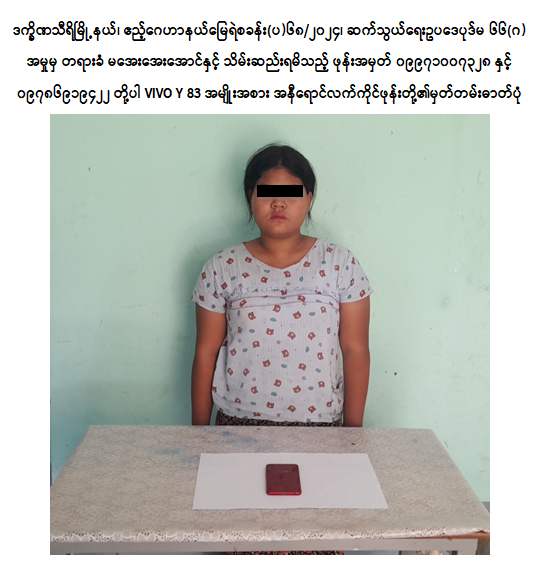 ထို့သို့ဆောင်ရွက်လျက်ရှိရာ နိုဝင်ဘာလ ၁၇ ရက်နေ့ နံနက်ပိုင်းတွင် Facebook လူမှုကွန်ရက်စာမျက်နှာပေါ်ရှိ အခေါက်ရွှေရောင်းသူဝယ်သူအမည်ပါ Facebook Group အတွင်း Amara Pan အမည်ပါ Facebook အကောင့်မှ “ငွေတုရောင်းတယ် မှတ်ပုံတင်တဲ့ရောင်းပေးတယ် လူလိမ်မဟုတ်ပါ လူလိမ်ထင်ရင်မဝယ်ပါနဲ့ Viber/ 09971007328 သို့ ဆက်သွယ်ပါ” စာသားနှင့် ငွေစက္ကူအတုပုံများ Post တင်ထားမှုအား စိစစ်တွေ့ရှိရသဖြင့် စုံစမ်းဖော်ထုတ်ခဲ့ရာ Amara Panအမည်ပါ Facebook အကောင့်ပိုင်ရှင်ဖြစ်သူ ဒက္ခိဏသီရိမြို့နယ်၊ ဇီးဖြူကုန်းကျေးရွာနေ မအေးအေးအောင် (၁၈) နှစ်အား နိုဝင်ဘာလ ၂၄ ရက်နေ့ နံနက် ၉ နာရီခွဲအချိန်တွင် ၎င်း၏နေအိမ်၌ ငွေစက္ကူအတုများရရှိမည်ဖြစ်ကြောင်း အခြားသူများ ယုံကြည်အောင် ပြောဆိုကာ ငွေကြေးလိမ်လည်ရယူခဲ့ရာ၌ အသုံးပြုခဲ့သော VIVO Y 83 အမျိုးအစား အနီရောင်လက်ကိုင်ဖုန်း ၁ လုံးနှင့်အတူ ဖမ်းဆီးရမိခဲ့သည်။