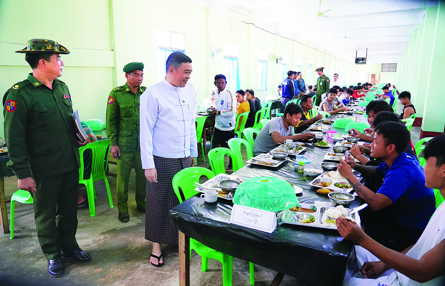 ထို့နောက် ဒုတိယဝန်ကြီးသည် ချက်ပြုတ်ရေးအဆောင်သို့သွားရောက်၍ စားရိပ်သာများနှင့် ချက်ပြုတ်ရေးအဆောင်များ သန့်ရှင်းရေးဆောင်ရွက်ထားမှု အခြေအနေများကို လှည့်လည်ကြည့်ရှုပြီး အစားအသောက်နှင့်ဆေးဝါးကွပ်ကဲရေးဦးစီးဌာန၏ သတ်မှတ်ချက်များနှင့်အညီ ပြင်ဆင်ချက်ပြုတ်ရန်၊ ချက်ပြုတ်ရေးအဖွဲ့များကို သန့်ရှင်းသပ်ရပ်စွာ ဝတ်စားဆင်ယင်၍ တစ်ကိုယ်ရေသန့်ရှင်းမှုရှိအောင် ကြပ်မတ်ဆောင်ရွက်ကြရန်မှာကြားသည်။