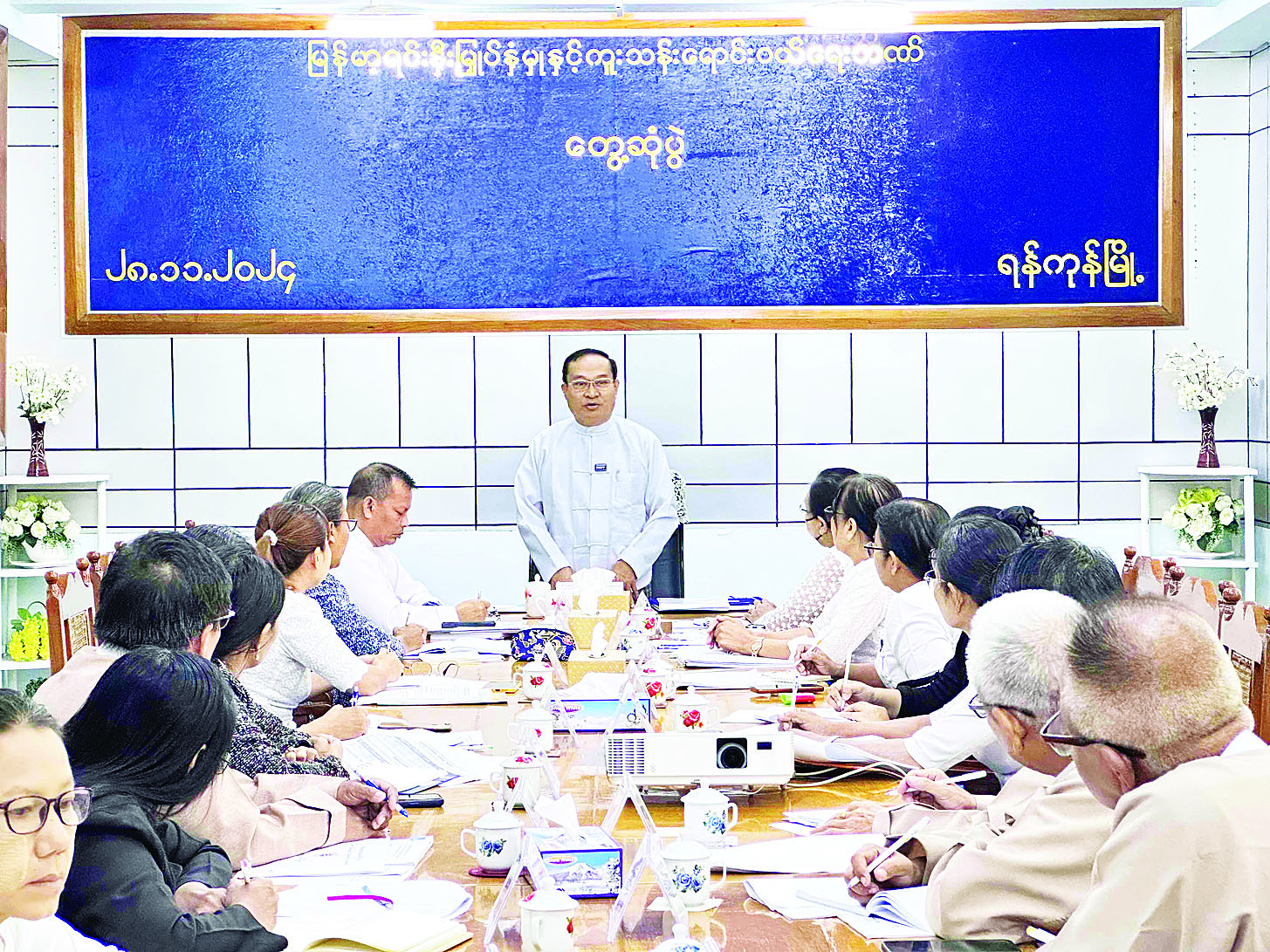 ထို့နောက် ဒုတိယဝန်ကြီးသည် ဘဏ်အစည်းအဝေးခန်းမ၌ ဝန်ထမ်းများကိုတွေ့ဆုံ၍ ဘဏ်ဝန်ဆောင်မှုပေးရာတွင် စီမံကိန်းနှင့် ဘဏ္ဍာရေးဝန်ကြီးဌာနနှင့် မြန်မာနိုင်ငံတော် ဗဟိုဘဏ်တို့မှ ထုတ်ပြန်ထားသည့် ညွှန်ကြားချက်များနှင့်အညီ တိတိကျကျလိုက်နာဆောင်ရွက်ရန်ဖြစ်ပြီး တာဝန်ရှိသူအဆင့်ဆင့်မှ တာဝန်ယူမှု၊ တာဝန်ခံမှုဖြင့် ဆောင်ရွက်သွားရန်လိုကြောင်း၊ ယင်းသို့ ဆောင်ရွက်ရာတွင် နိုင်ငံတော်၏ စီးပွားရေးဦးတည်ချက်များကို အထောက်အကူပြုစေရေး ကြိုးပမ်းဆောင်ရွက်ကြရမည်ဖြစ်ကြောင်း၊ နည်းဥပဒေပြဋ္ဌာန်းချက်များနှင့်အညီ တိတိကျကျလိုက်နာဆောင်ရွက်ကြရမည်ဖြစ်ကြောင်း၊ ငွေရေးကြေးရေး အဖွဲ့အစည်းဖြစ်၍ စာရင်းအင်းတိကျမှန်ကန်မှုသည် အလွန်အရေးကြီးသဖြင့် အချက်အလက်များ မှန်ကန်စေရေး အလေးထားဆောင်ရွက်ကြရန်လိုကြောင်း၊ ပြည်သူလူထုနှင့်ထိတွေ့ဆောင်ရွက်နေသည့် အဖွဲ့အစည်းဖြစ်၍ ဆက်ဆံရေးကောင်း မွန်ရန်လိုအပ်ကြောင်း၊ ဘဏ်အနေဖြင့် စီမံကိန်းလျာထားချက်ပါ အတိုင်းအောင်မြင်စေရေး ကြိုးပမ်းဆောင်ရွက်ကြရန်လိုအပ်ကြောင်းမှာကြား၍ တင်ပြချက်များအပေါ် လိုအပ်သည်များ ညှိနှိုင်းဆောင်ရွက်ပေးပြီး ဝန်ထမ်းများကိုရင်းရင်းနှီးနှီး တွေ့ဆုံနှုတ်ဆက်ခဲ့ကြောင်း သိရှိရသည်။