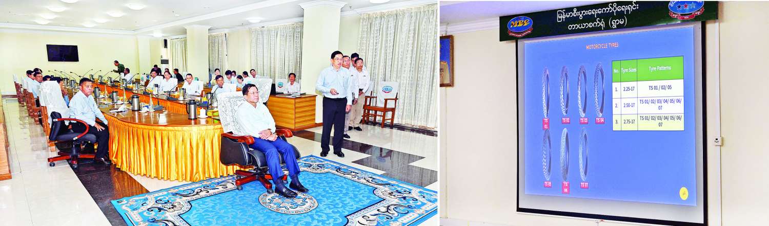 ထို့နောက် စက်ရုံအစည်းအဝေးခန်းမတွင် မြန်မာစီးပွားရေးကော်ပိုရေးရှင်းဥက္ကဋ္ဌ ဗိုလ်ချုပ်ကြီး ညိုစော၊ စက်ရုံမှူးကြီး ဦးကျော်ကျော်စိုးတို့က စက်ရုံသမိုင်းအကျဉ်း၊ စက်ရုံလုပ်ငန်းဆောင်ရွက်နေမှု၊ နိုင်ငံတော်စီမံအုပ်ချုပ်ရေးကောင်စီဥက္ကဋ္ဌ နိုင်ငံတော်ဝန်ကြီးချုပ်လာရောက်စစ်ဆေးစဉ် လမ်းညွှန်ချက်များအား အကောင်အထည်ဖော်ဆောင်ရွက်လျက်ရှိမှု၊ ပြည်တွင်းလိုအပ်ချက်များသည့် မော်တော်ဆိုင်ကယ်တာယာအား တိုးမြှင့်ထုတ်လုပ်နိုင်ရေးဆောင်ရွက်လျက်ရှိမှုနှင့် သုံးဘီးဆိုင်ကယ်တာယာများ ထုတ်လုပ်နိုင်ရေးဆောင်ရွက်လျက်ရှိမှု၊ ပြည်တွင်းဈေးကွက်နှင့်ပြည်ပဈေးကွက်ပိုမိုရရှိရေးအတွက် ဆက်လက်ဆောင်ရွက်လျက်ရှိမှု အခြေအနေများကို ရှင်းလင်းတင်ပြကြသည်။