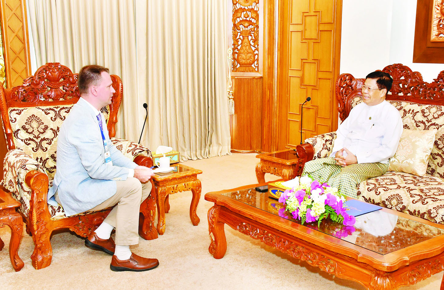 ဒုတိယဝန်ကြီးချုပ်နှင့် နိုင်ငံခြားရေးဝန်ကြီးဌာန ပြည်ထောင်စုဝန်ကြီး ဦးသန်းဆွေသည် ရုရှားဖက်ဒရေးရှင်းနိုင်ငံပိုင် သတင်းဌာနဖြစ်သည့် ITAR-TASS သတင်းဌာန၏ ထိုင်းနိုင်ငံဌာနခွဲ အကြီးအကဲ Mr. Igor Brovarnik ကို ယနေ့မွန်းလွဲ ၁ နာရီခွဲတွင် နေပြည်တော်ရှိ နိုင်ငံခြားရေးဝန်ကြီးဌာန၌ လက်ခံတွေ့ဆုံ၍ ရုပ်သံအင်တာဗျူးဖြေကြားသည်။