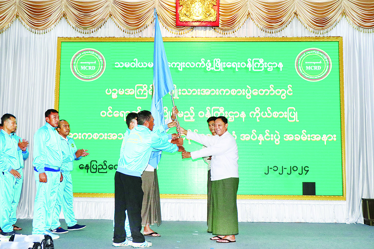 ပဉ္စမအကြိမ် အမျိုးသားအားကစားပွဲတော်တွင် ပါဝင်ယှဉ်ပြိုင်ကြမည့် သမဝါယမနှင့် ကျေးလက်ဖွံ့ဖြိုးရေး ဝန်ကြီးဌာနကိုယ်စားပြု အားကစားသမားများထံ အောင်နိုင်ရေးအလံပေးအပ်ပွဲကို ယနေ့မွန်းလွဲပိုင်းက ဝန်ကြီးဌာနအစည်းအဝေးခန်းမ၌ ကျင်းပပြုလုပ်ရာ ပြည်ထောင်စုဝန်ကြီး ဦးလှမိုး၊ ဒုတိယဝန်ကြီး ဦးမြင့်စိုး၊ အမြဲတမ်းအတွင်းဝန်၊ ညွှန်ကြားရေးမှူးချုပ်များ၊ အုပ်ချုပ်သူနည်းပြများ၊ အားကစားသမားများနှင့် တာဝန်ရှိသူများ တက်ရောက်ကြသည်။