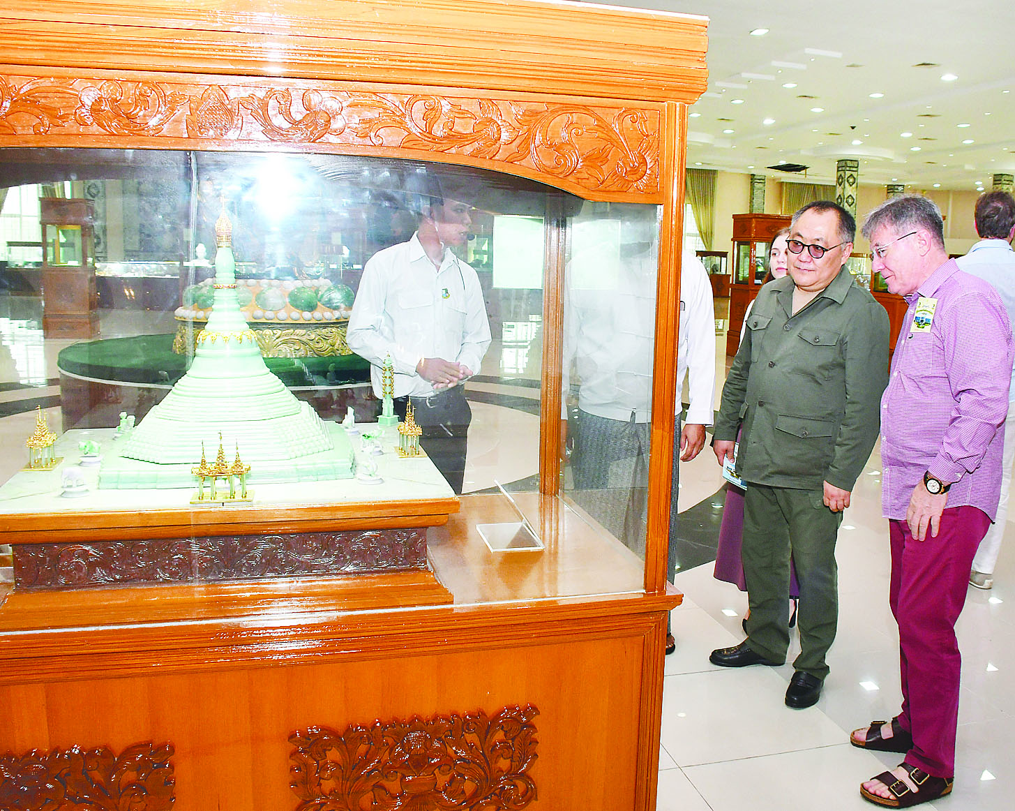 ယင်းနောက် ကျောက်မျက်ရတနာပြတိုက်သို့ သွားရောက်လေ့လာကြရာ ပြတိုက်တာဝန်ရှိသူများက ပြတိုက်အတွင်းခင်းကျင်းပြသထားသည့် ကျောက်စိမ်းတစ်တုံးတည်းမှ ထွင်းထုထားသော ဥပ္ပါတသန္တိပုံစံတူကျောက်စိမ်းစေတီတော်၊ မြန်မာ့အကြီးဆုံး ပုလဲရတနာ၊ အရည်အသွေးမြင့် ကျောက်စိမ်းတုံးများ၊ ရှားပါးမြန်မာ့တွင်းထွက်ရတနာများဖြစ်သည့် ပတ္တမြား၊ နီလာနှင့် အခြားအဖိုးတန် ကျောက်မျက်ရတနာများကို လိုက်လံရှင်းလင်းပြသကြပြီး ဒူးမားလွှတ်တော် ဒုတိယဥက္ကဋ္ဌက ဧည့်သည်တော်မှတ်တမ်းတွင် လက်မှတ်ရေးထိုးကာ ပြခန်းအောက်ထပ်ရှိ ကျောက်မျက်ရတနာအရောင်းဆိုင်များကို လေ့လာကြည့်ရှုကြသည်။