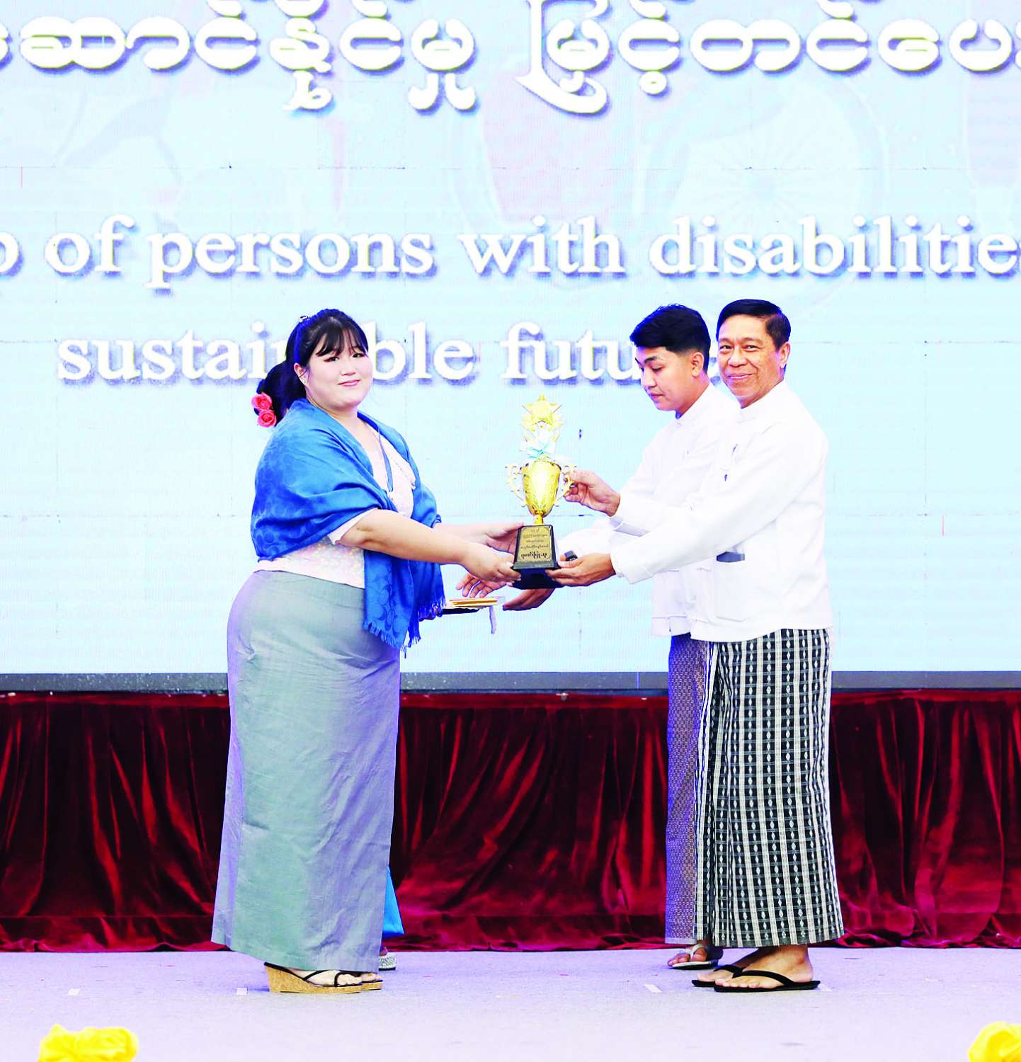 ထို့နောက် နိုင်ငံတော်စီမံအုပ်ချုပ်ရေးကောင်စီအဖွဲ့ဝင် ဗိုလ်ချုပ်ကြီး တင်အောင်စန်းက အခြေခံပညာအထက်တန်းအဆင့် စာစီစာကုံးပြိုင်ပွဲတွင် ဆုရရှိကြသူများကိုလည်းကောင်း၊ နိုင်ငံတော်စီမံအုပ်ချုပ်ရေးကောင်စီအဖွဲ့ဝင် ဒုတိယဗိုလ်ချုပ်ကြီး ရာပြည့်က မသန်စွမ်းသူများအတွက် အတားအဆီးမဲ့ ခရီးသွားလာရေးဂုဏ်ပြုဆု ရရှိကြသူများကိုလည်းကောင်း၊ မသန်စွမ်းသူများ၏ အခွင့်အရေးများဆိုင်ရာ အမျိုးသားကော်မတီဒုတိယဥက္ကဋ္ဌ (၁) ပြည်ထောင်စုဝန်ကြီး ဒေါက်တာစိုးဝင်းက အလုပ်အကိုင်အခွင့်အလမ်းဂုဏ်ပြုဆုနှင့် စာစီစာကုံးပြိုင်ပွဲများတွင် ပါဝင်ယှဉ်ပြိုင်ခဲ့ကြသည့် ကျောင်းသား၊ ကျောင်းသူများကိုလည်းကောင်း ဂုဏ်ပြုဆုနှင့် ဂုဏ်ပြုမှတ်တမ်းလွှာများ ပေးအပ်ကြသည်။