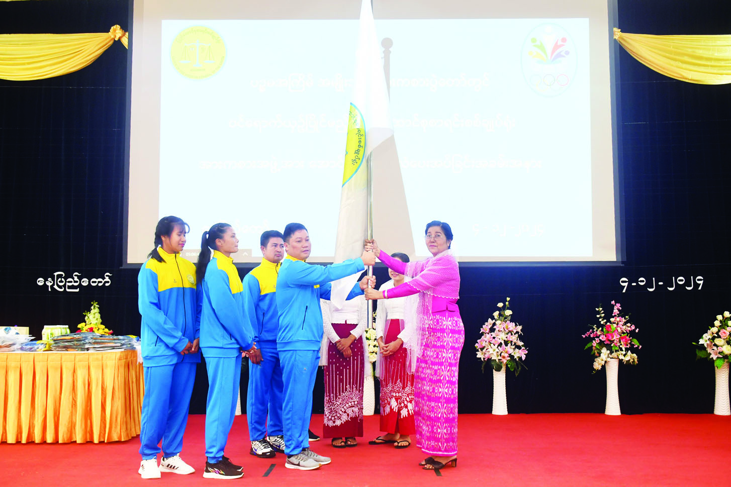 ပဉ္စမအကြိမ် အမျိုးသားအားကစားပွဲတော်တွင်ပါဝင် ယှဉ်ပြိုင်ကြမည့် ပြည်ထောင်စုစာရင်းစစ်ချုပ်ရုံးကိုယ်စားပြု အားကစားသမားများအားအောင် နိုင်ရေးအလံ ပေးအပ်ပွဲကို ယနေ့မွန်းလွဲပိုင်းတွင် နေပြည်တော်ရှိ ပြည်ထောင်စုစာရင်းစစ်ချုပ်ရုံး နဝရတ်ခန်းမ၌ကျင်းပရာ ပြည်ထောင်စုစာရင်းစစ်ချုပ် ဒေါက်တာခင်နိုင်ဦး၊ ဒုတိယစာရင်းစစ်ချုပ်နှင့် တာဝန်ရှိသူများ၊ အားကစားအသင်း အုပ်ချုပ်သူ၊ နည်းပြများနှင့် အားကစားသမားများ တက်ရောက်ကြပြီး ရန်ကုန်တိုင်းဒေသကြီး၊ ရှမ်းပြည်နယ်၊ ဧရာဝတီတိုင်းဒေသကြီး စာရင်းစစ်ချုပ်ရုံးမှ တာဝန်ရှိသူများက Online ဖြင့် တက်ရောက်ကြသည်။