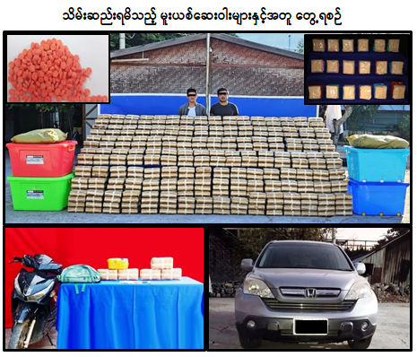 မူးယစ်ဆေးဝါးတားဆီးနှိမ်နင်းရေးရဲတပ်ဖွဲ့မှ တပ်ဖွဲ့ဝင်များပါဝင်သော ပူးပေါင်းအဖွဲ့သည် နိုဝင်ဘာလ ၂၂ ရက်နေ့ နံနက် ၆ နာရီခွဲအချိန် မန္တလေးတိုင်းဒေသကြီး၊ ပုသိမ်ကြီးမြို့နယ်၊ ၁၀၁ လမ်းနှင့် မြို့ပတ်လမ်းထောင့်တွင် ကျော်သူလွင်(ခ)မွန်ချေး မောင်းနှင်လာသည့် မော်တော်ဆိုင်ကယ်ကို သတင်းအရရှာဖွေရာ စိတ်ကြွရူးသွပ်ဆေးပြား ၆၀,၀၀၀ ပြား စတင်ဖမ်းဆီးရမိခဲ့ပြီး ၎င်းငှားရမ်းနေထိုင်သည့် ပုသိမ်ကြီးမြို့နယ်၊ အောင်မင်္ဂလာ(၁)ရပ်ကွက်ရှိ နေအိမ်၌ သိုဝှက်ထားသည့် စိတ်ကြွရူးသွပ်ဆေးပြား ၆၀ ဒသမ ၄ သိန်းအားလည်းကောင်း၊ မန္တလေးမြို့ ၊ ၃၅ လမ်းနှင့် ၅၄ လမ်းထောင့်ရှိ ဟိုတယ်အခန်းတွင် ရောင်းချရန်အသင့်ထားရှိသည့် ဘိန်းဖြူ ၄၄၀ ဂရမ်အားလည်းကောင်း အသီးသီးဆက်လက်သိမ်းဆည်းရမိခဲ့သဖြင့် စုစုပေါင်းဒေသကာလတန်ဖိုးငွေကျပ် ၉ ဒသမ ၁ ဘီလီယံကျော်တန်ဖိုးရှိ စိတ်ကြွရူးသွပ် ဆေးပြား ၆၁ သိန်း၊ ဘိန်းဖြူ ၄၄၀ ဂရမ် သိမ်းဆည်းရမိခဲ့ကြောင်း၊ ကွင်းဆက်ဖော်ထုတ်ချက်အရ ယင်းနေ့မွန်းလွဲ ၁ နာရီအချိန် မူးယစ်ဆေးဝါးများ သယ်ဆောင်ရောင်းဝယ်ရာတွင် ပူးပေါင်းပါဝင်သူ အောင်ခိုင်မင်း(ခ)ဖိုးလုံးအား CRV မော်တော်ယာဉ် ၁ စီးနှင့်အတူ မန္တလေးမြို့ ၊ ၅၁ လမ်း၊ ၁၂၃ x ၁၂၄ လမ်းကြား၌ ဖမ်းဆီးရမိခဲ့သဖြင့် ၎င်းတို့အား ဥပဒေအရ အရေးယူထားရှိပြီး ကွင်းဆက်ပြစ်မှုကျူးလွန်သူများအား စစ်ဆေးဖော်ထုတ်လျက်ရှိကြောင်း သတင်းရရှိသည်။