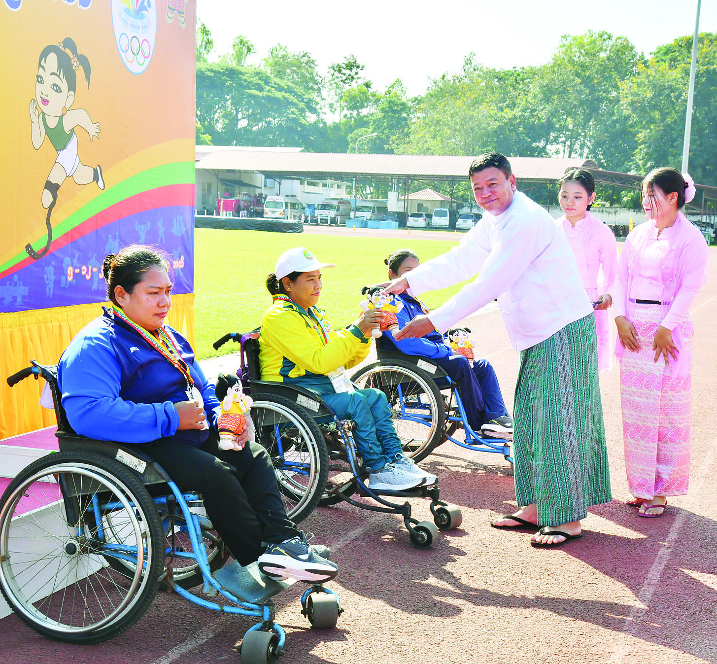 ၂၀၂၄ ခုနှစ် ပဉ္စမအကြိမ်အမျိုးသားအားကစားပွဲတော် မသန်စွမ်းအားကစားပြိုင်ပွဲများကို ယနေ့နံနက်ပိုင်းတွင် နေပြည်တော်ရှိ လယ်ဝေး TC-2 အားကစားကွင်း၌ ယှဉ်ပြိုင်ကစားကြရာ နိုင်ငံတော်စီမံအုပ်ချုပ်ရေးကောင်စီအဖွဲ့ဝင်များ တက်ရောက်ကြည့်ရှုအားပေးကြပြီး ဆုများပေးအပ်ချီးမြှင့်ကြသည်။