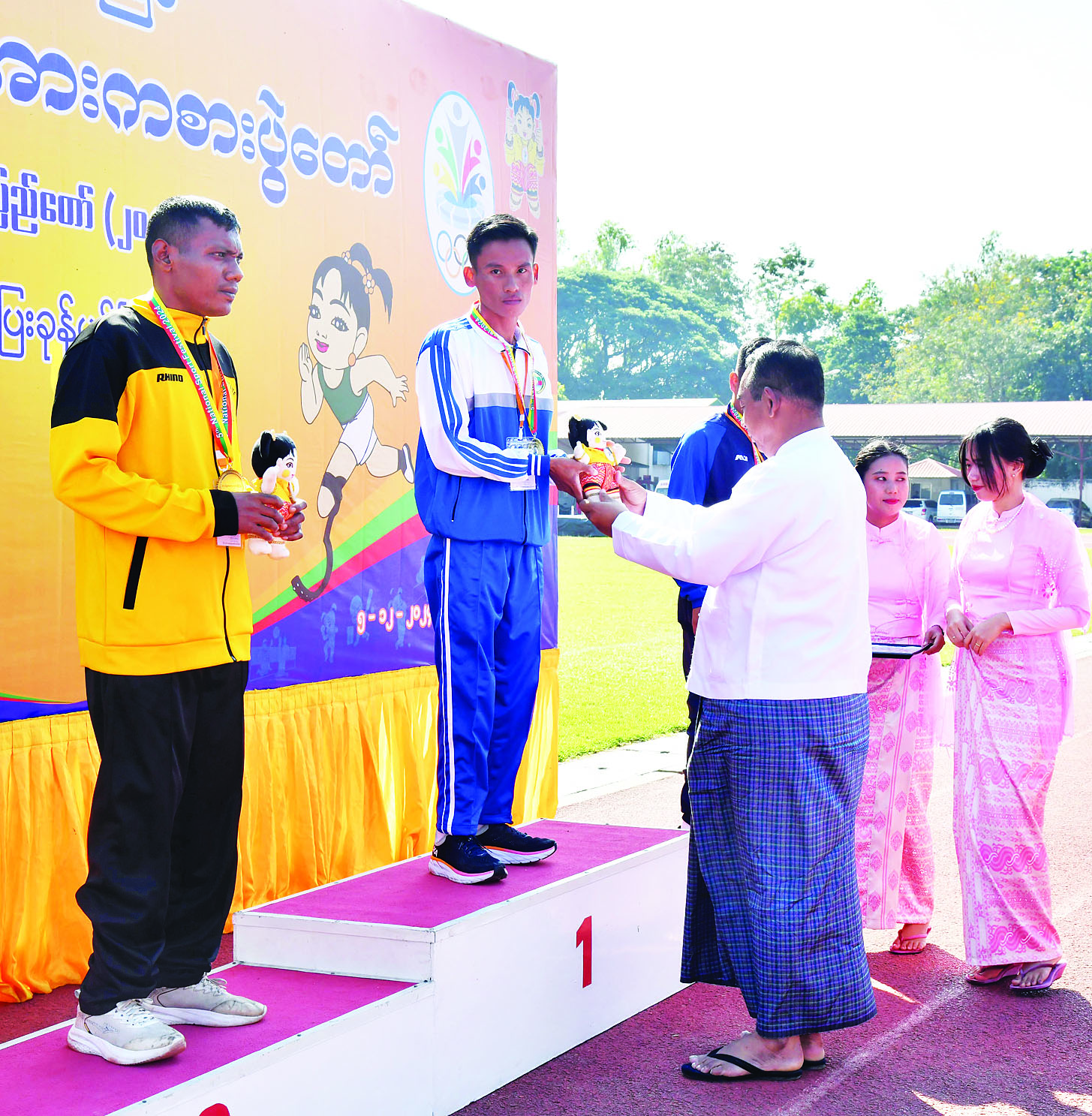 ထို့နောက် နိုင်ငံတော်စီမံအုပ်ချုပ်ရေးကောင်စီအဖွဲ့ဝင် ပိုးရယ်အောင်သိန်းက အမျိုးသမီးအလျားခုန် T44/64 ပြိုင်ပွဲတွင် ပထမဆုရရှိသည့် ဧရာဝတီတိုင်းဒေသကြီး၊ ဒုတိယဆုရရှိသည့် မွန်ပြည်နယ်နှင့် တတိယဆုရရှိသည့် ဧရာဝတီတိုင်းဒေသကြီးတို့မှ ပြိုင်ပွဲဝင်များကိုလည်းကောင်း၊ နိုင်ငံတော်စီမံအုပ်ချုပ်ရေးကောင်စီအဖွဲ့ဝင် မန်းငြိမ်းမောင်က အမျိုးသားသံပြားပစ် F64 ပြိုင်ပွဲတွင် ပထမဆုရရှိသည့် ပဲခူးတိုင်းဒေသကြီး၊ ဒုတိယဆုနှင့် တတိယဆုရရှိသည့် မန္တလေးတိုင်းဒေသကြီးတို့မှ ပြိုင်ပွဲဝင်များကိုလည်းကောင်း၊ နိုင်ငံတော်စီမံအုပ်ချုပ်ရေးကောင်စီအဖွဲ့ဝင် ဒေါ်ဒွဲဘူက အမျိုးသားလှံတံပစ် F46 ပြိုင်ပွဲတွင် ပထမဆုနှင့် ဒုတိယဆုရရှိသည့် မွန်ပြည်နယ်နှင့် တတိယဆုရရှိသည့် မန္တလေးတိုင်းဒေသကြီးတို့မှ ပြိုင်ပွဲဝင်များကိုလည်းကောင်း ဂုဏ်ပြုဆုတံဆိပ်နှင့် အမျိုးသားအားကစားပွဲတော်အထိမ်းအမှတ်အရုပ်ကို ပေးအပ်ချီးမြှင့်ကြသည်။