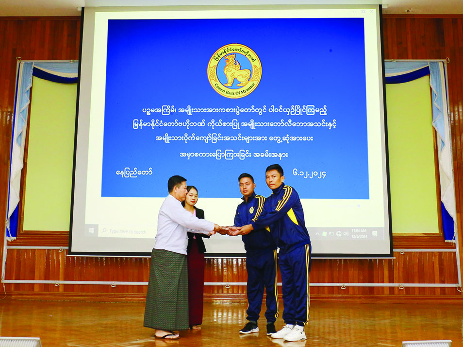 မြန်မာနိုင်ငံတော်ဗဟိုဘဏ်ဒုတိယဥက္ကဋ္ဌ ဦးဇော်မြင့်နိုင်သည် ပဉ္စမအကြိမ် အမျိုးသားအားကစားပွဲတော်တွင် ပါဝင်ယှဉ်ပြိုင်ကြမည့် မြန်မာနိုင်ငံတော် ဗဟိုဘဏ်ကိုယ်စားပြု အားကစားသမားများအား ယနေ့နံနက်ပိုင်းတွင် တွေ့ဆုံအားပေး၍ ထောက်ပံ့ငွေများ ပေးအပ်သည်။