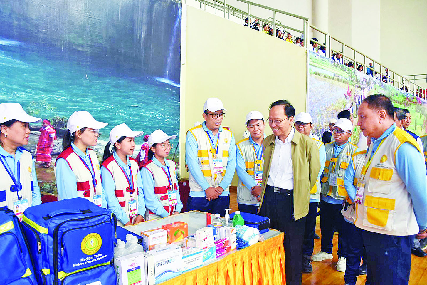 ဆက်လက်၍ ပြည်ထောင်စုဝန်ကြီးနှင့်အဖွဲ့သည် အမျိုးသားအားကစားပွဲတော် ပါဝင်ယှဉ်ပြိုင်ကြမည့် အားကစားသမားများအတွက် ကျန်းမာရေးစောင့်ရှောက်မှုလုပ်ငန်း၌ အသုံးပြုသည့် လူနာတင်ယာဉ်များတွင် ထိခိုက်ဒဏ်ရာလူနာများအတွက် အရေးပေါ်အသက်ကယ်ဆေးနှင့် ဆေးပစ္စည်းများ ဖြည့်ဆည်းထားရှိမှုနှင့် စနစ်တကျအသုံးပြုနိုင်ရေး စီစဉ်ထားရှိမှု၊ အောက်ဆီဂျင်၊ အသက်ရှူကိရိယာ၊ လူနာအခြေအနေအလိုက် သယ်ယူပို့ဆောင်ပစ္စည်း အမျိုးမျိုး၊ အလွယ်တကူ သယ်ဆောင်နိုင်သည့် ဆေးအိတ်များကို ကြည့်ရှုစစ်ဆေးကာ လိုအပ်ချက်နှင့်အညီ လွယ်လင့်တကူအသုံးပြုနိုင်ရေး စီစဉ်ထားရှိရန် မှာကြားသည်။