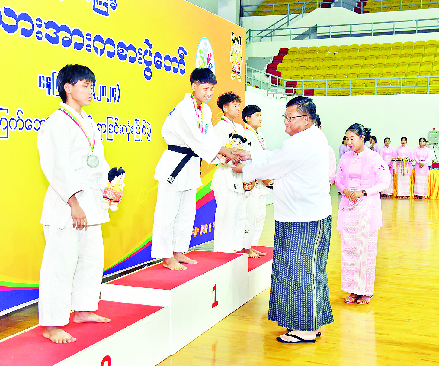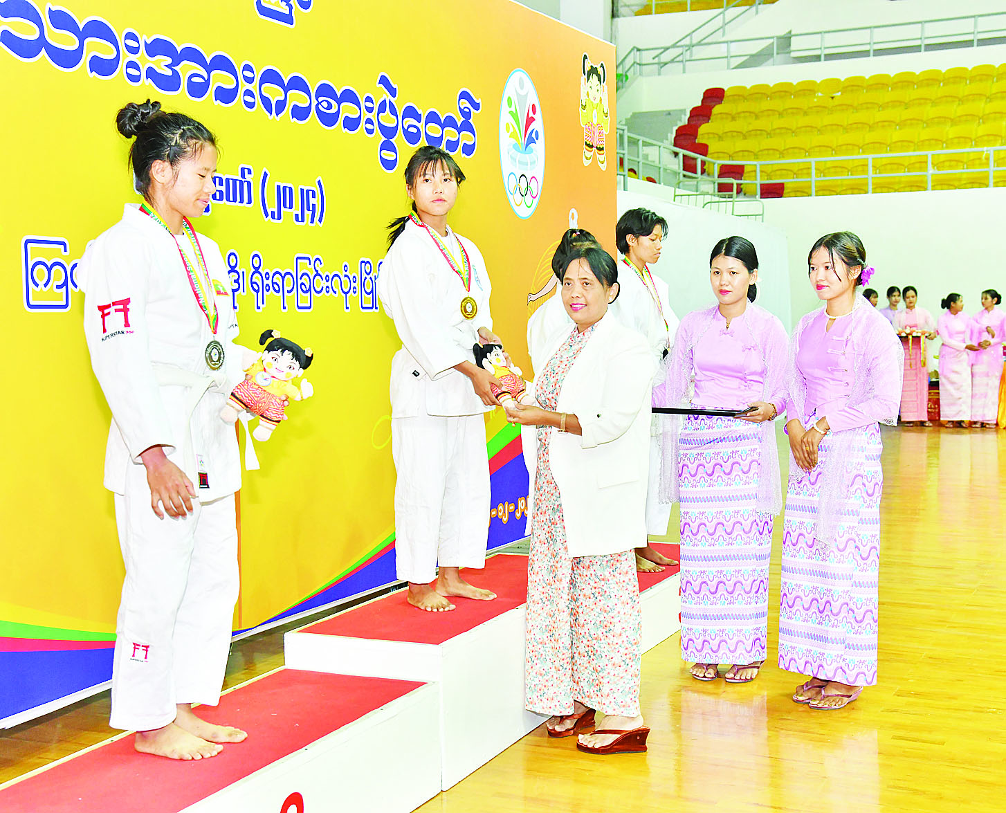 ထို့နောက် နိုင်ငံတော်စီမံအုပ်ချုပ်ရေးကောင်စီအဖွဲ့ဝင် ဦးရန်ကျော်က အမျိုးသမီး (-၄၈ ကီလိုတန်း) ဂျူဒိုအတိုက်ပြိုင်ပွဲတွင် ပထမဆုရရှိသည့် ကချင်ပြည်နယ်၊ ဒုတိယဆုရရှိသည့် ဧရာဝတီတိုင်းဒေသကြီးနှင့် ပူးတွဲတတိယဆုရရှိသည့် မန္တလေးတိုင်းဒေသကြီးနှင့် ရန်ကုန်တိုင်းဒေသကြီးအသင်းတို့မှ ပြိုင်ပွဲဝင်များကိုလည်းကောင်း၊ နိုင်ငံတော်စီမံအုပ်ချုပ်ရေးကောင်စီအဖွဲ့ဝင် ဦးရွှေကြိမ်းက အမျိုးသမီး (-၅၂ ကီလိုတန်း) ဂျူဒိုအတိုက်ပြိုင်ပွဲတွင် ပထမဆုရရှိသည့် ဧရာဝတီတိုင်းဒေသကြီး၊ ဒုတိယဆုရရှိသည့် မွန်ပြည်နယ်နှင့် ပူးတွဲတတိယဆုရရှိသည့် ချင်းပြည်နယ်နှင့် ကချင်ပြည်နယ်အသင်းတို့မှ ပြိုင်ပွဲဝင်များကိုလည်းကောင်း၊ နိုင်ငံတော် စီမံအုပ်ချုပ်ရေးကောင်စီအဖွဲ့ဝင် ဒေါ်ဒွဲဘူကအမျိုးသမီး (- ၅၇ ကီလိုတန်း) ဂျူဒိုအတိုက်ပြိုင်ပွဲတွင် ပထမဆုရရှိသည့် စစ်ကိုင်းတိုင်းဒေသကြီး၊ ဒုတိယဆုရရှိသည့် ကချင်ပြည်နယ်နှင့် ပူးတွဲတတိယဆုရရှိသည့် မန္တလေးတိုင်းဒေသကြီးနှင့် ရှမ်းပြည်နယ်အသင်းတို့မှ ပြိုင်ပွဲဝင်များ ကိုလည်းကောင်း တစ်ဦးချင်းဂုဏ်ပြု ဆုတံဆိပ်နှင့် အမျိုးသားအားကစား ပွဲတော်အထိမ်းအမှတ်အရုပ်အား ပေးအပ်ချီးမြှင့်ကြသည်။