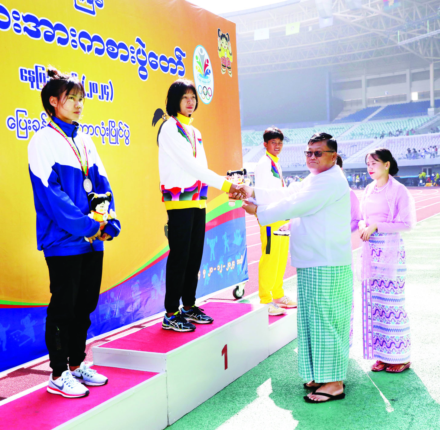 ထို့နောက် ဆုချီးမြှင့်ပွဲအခမ်းအနားကို ဆက်လက်ကျင်းပရာ မြန်မာနိုင်ငံပြေးခုန်ပစ်အဖွဲ့ချုပ် အမှုဆောင် ဒေါ်သန်းသန်းက အမျိုးသားမီတာ(၈၀၀) အပြေးပြိုင်ပွဲတွင် ပထမဆုရရှိသည့် ပဲခူးတိုင်းဒေသကြီး၊ ဒုတိယဆုရရှိသည့် ပြည်ထောင်စုနယ်မြေ နေပြည်တော်နှင့် တတိယဆုရရှိသည့် ဧရာဝတီတိုင်းဒေသကြီးတို့မှ ပြိုင်ပွဲဝင်များကို လည်းကောင်း၊ မြန်မာနိုင်ငံပြေးခုန်ပစ်အမှုဆောင် ဒေါ်ဂျနီဖာတင်လေးက အမျိုးသမီးမီတာ (၈၀၀) အပြေးပြိုင်ပွဲတွင် ပထမဆုရရှိသည့် ချင်းပြည်နယ်၊ ဒုတိယဆုရရှိသည့် ကယားပြည်နယ်နှင့် တတိယဆုရရှိသည့် ရှမ်းပြည်နယ်တို့မှ ပြိုင်ပွဲဝင်များကိုလည်းကောင်း၊ မြန်မာနိုင်ငံ ပြေးခုန်ပစ်အဖွဲ့ချုပ် ဒုတိယဥက္ကဋ္ဌ ဦးကျော်ကျော်ဦးက အမျိုးသမီး မီတာ(၂၀၀) အပြေးပြိုင်ပွဲတွင် ပထမဆုနှင့် ဒုတိယဆုရရှိသည့် တနင်္သာရီတိုင်းဒေသကြီးနှင့် တတိယဆုရရှိသည့် မကွေးတိုင်းဒေသကြီးတို့မှ ပြိုင်ပွဲဝင်များကိုလည်းကောင်း၊ ရန်ကုန်တိုင်း ပြေးခုန်ပစ်ဆပ်ကော်မတီ ဒုတိယဥက္ကဋ္ဌ ဒေါက်တာ ထက်ထက်အောင်က အမျိုးသမီးမီတာ(၂၀၀) အပြေးပြိုင်ပွဲတွင် ပထမဆုရရှိသည့် တနင်္သာရီတိုင်းဒေသကြီး၊ ဒုတိယဆုရရှိသည့် ဧရာဝတီတိုင်းဒေသကြီးနှင့် တတိယဆုရရှိသည့် တနင်္သာရီတိုင်းဒေသကြီးတို့မှ ပြိုင်ပွဲဝင်များကိုလည်းကောင်း ဂုဏ်ပြုဆုတံဆိပ်နှင့် အမျိုးသားအားကစားပွဲတော်အထိမ်းအမှတ် အရုပ်များအား ပေးအပ်ချီးမြှင့်ကြသည်။