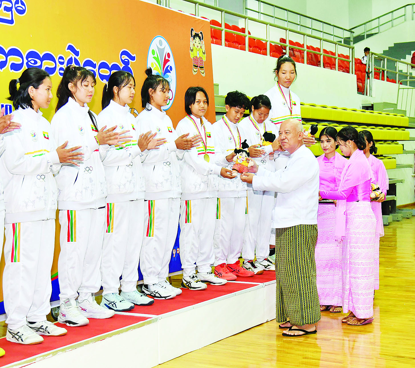 ယင်းနောက် ပြည်ထောင်စုဝန်ကြီး Jeng Phang နော်တောင်က အမျိုးသမီးအသင်းလိုက် ကကွက်ပြိုင်ပွဲတွင် ပထမဆုရရှိသည့် ရန်ကုန်တိုင်းဒေသကြီး၊ ဒုတိယဆုရရှိသည့် ကယားပြည်နယ်၊ ပူးတွဲတတိယဆုရရှိသည့် ရှမ်းပြည်နယ်နှင့် ပဲခူးတိုင်းဒေသကြီးအသင်းတို့မှ ပြိုင်ပွဲဝင်များ ကိုလည်းကောင်း၊ ပြည်ထောင်စုဝန်ကြီး ဦးမင်းသိန်းဇံက အမျိုးသားအသင်းလိုက် ကကွက်ပြိုင်ပွဲတွင် ပထမဆုရရှိသည့် ရန်ကုန်တိုင်းဒေသကြီး၊ ဒုတိယဆုရရှိသည့် ပဲခူးတိုင်းဒေသကြီး၊ ပူးတွဲတတိယဆုရရှိသည့် မွန်ပြည်နယ်နှင့် ကရင်ပြည်နယ်အသင်းတို့မှ ပြိုင်ပွဲဝင်များကိုလည်းကောင်း တစ်ဦးချင်းဂုဏ်ပြုဆုတံဆိပ်နှင့် အမျိုးသားအားကစားပွဲတော် အထိမ်းအမှတ်လာဘ်ကောင် (Mascot) အရုပ်များအား ပေးအပ်ချီးမြှင့်ကြသည်။
