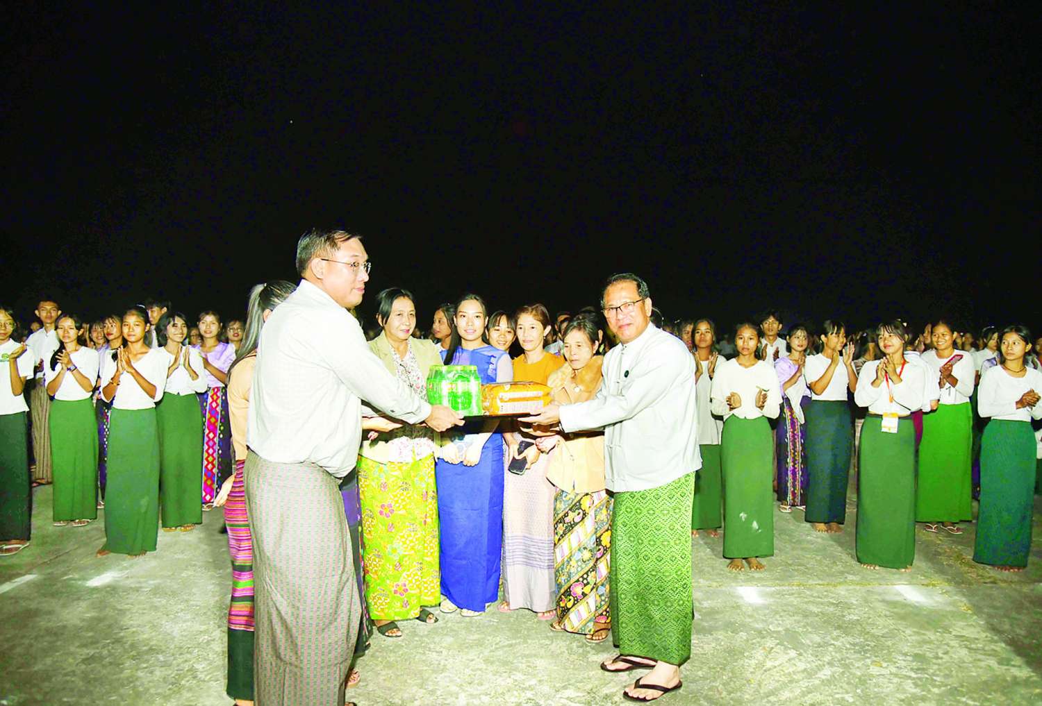 ထို့နောက် ပြည်ထောင်စုဝန်ကြီးက အနုပညာဦးစီးဌာနမှ အကနည်းပြ ဆရာ ဆရာမများ၊ အခြေခံပညာအထက်တန်းကျောင်းများမှ ကြီးကြပ်ဆရာမများ၊ တိုင်းရင်းသား တိုင်းရင်းသူများနှင့် ကျောင်းသူများအတွက် စားသောက်ဖွယ်ရာများ ပေးအပ်ပြီး အားပေးစကားပြောကြားခဲ့သည်။