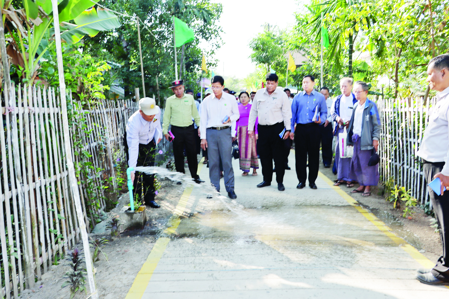 ထို့နောက် ဓနုဖြူမြို့နယ် ငါးဘတ်အိုင်ခေတ်မီစံပြကျေးရွာ (Smart Village) သို့ သွားရောက်ပြီး ကျေးလက်ဒေသဖွံ့ဖြိုးတိုးတက်ရေးဦးစီးဌာန၏ ၂၀၂၄-၂၀၂၅ ဘဏ္ဍာနှစ် ခေတ်မီစံပြကျေးရွာထူထောင်ရေးရန်ပုံငွေဖြင့် တည်ဆောက်ခဲ့သည့် ကျေးရွာဘက်စုံသုံးခန်းမဖွင့်ပွဲသို့ တက်ရောက်ကာ အခမ်းအနားဆိုင်းဘုတ်ကို စက်ခလုတ်နှိပ်ဖွင့်လှစ်ပေးပြီး ကျေးရွာသူကျေးရွာသားများ၊ ဌာနဆိုင်ရာဝန်ထမ်းများနှင့်တွေ့ဆုံကာ ကျေးရွာတွင်းလမ်းများနှင့် ကျေးရွာရေပေးရေးစနစ် ဆောင်ရွက်ပေးထားမှုများကို လှည့်လည်ကြည့်ရှုစစ်ဆေးသည်။