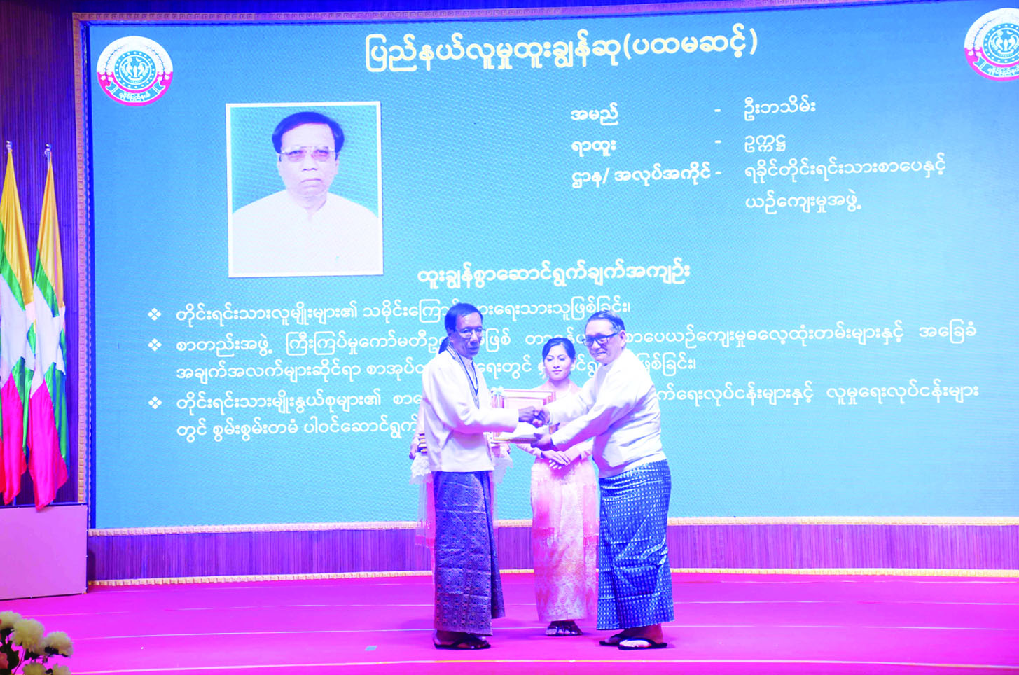 ထို့နောက် နိုင်ငံတော်စီမံအုပ်ချုပ်ရေးကောင်စီအဖွဲ့ဝင် ဒေါက်တာဘရွှေနှင့် ဒေါက်တာမှုထန်တို့က ပြည်နယ်စီမံထူးချွန်ဆု (ပထမဆင့်) ရရှိသူများ၊ ပြည်နယ်စက်မှုစီးပွားထူးချွန်ဆု (ပထမဆင့်) ရရှိသူများ၊ ပြည်နယ်လူမှုထူးချွန်ဆု (ပထမဆင့်) ရရှိသူများအား ဂုဏ်ထူးဆောင်ဆုလက်မှတ်နှင့် ဂုဏ်ထူးဆောင်ဆုပစ္စည်းများ ပေးအပ်ချီးမြှင့် ကြသည်။