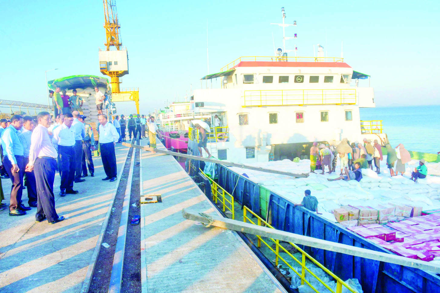 ထို့နောက် စစ်တွေမြို့ ဘက်စုံသုံးဆိပ်ကမ်းတွင် အမျိုးသားသဘာဝဘေးအန္တရာယ်ဆိုင်ရာ စီမံခန့်ခွဲမှုကော်မတီ၏ လမ်းညွှန်မှုအရ ရခိုင်ပြည်နယ်အစိုးရအဖွဲ့နှင့် ရန်ကုန်တိုင်းဒေသကြီးအစိုးရအဖွဲ့၏ စီစဉ်ကြီးကြပ်မှုဖြင့် သင်္ဘောများ၊ ရေယာဉ်များဖြင့် လူသုံးကုန်ပစ္စည်းများ ရောက်ရှိလာမှုကို သွားရောက်ကြည့်ရှု စစ်ဆေးကြပြီး ညနေပိုင်းတွင် စစ်တွေမြို့ ခိုင်သဇင်ခန်းမ၌ ကျင်းပသော နှစ် (၅၀) ပြည့် ရွှေရတုရခိုင်ပြည်နယ်နေ့အထိမ်းအမှတ် ဂုဏ်ပြုညစာစားပွဲသို့ တက်ရောက်ကြကြောင်း သိရသည်။
