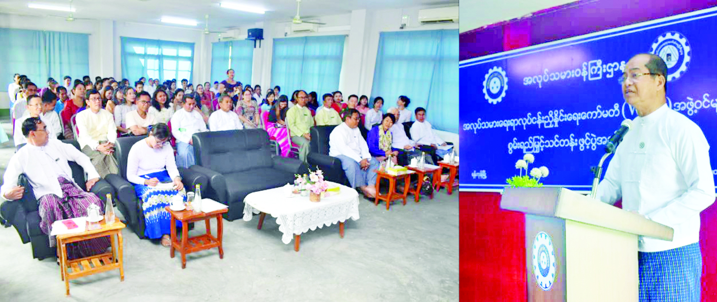 အလုပ်သမားရေးရာ လုပ်ငန်းညှိနှိုင်းရေးကော်မတီ(WCC)အဖွဲ့ဝင်များ၏ စွမ်းရည်မြှင့်သင်တန်းကို ယနေ့နံနက်ပိုင်းတွင် ရန်ကုန်တိုင်းဒေသကြီး လှိုင်သာယာမြို့နယ်ရှိ အမျိုးသား လုပ်ငန်းခွင် ဘေးအန္တရာယ်ကင်းရှင်းရေးနှင့် ကျန်းမာရေးသင်တန်းကျောင်း၌ ကျင်းပရာ အလုပ်သမားဝန်ကြီးဌာန ဒုတိယဝန်ကြီး ဦးဝင်းရှိန်၊ ဌာနဆိုင်ရာအကြီးအကဲများနှင့် တာဝန်ရှိသူများ၊ သင်တန်းနည်းပြများနှင့် အလုပ်သမားရေးရာလုပ်ငန်း ညှိနှိုင်းရေးကော်မတီ(WCC) အဖွဲ့ဝင်များ တက်ရောက်ကြသည်။
