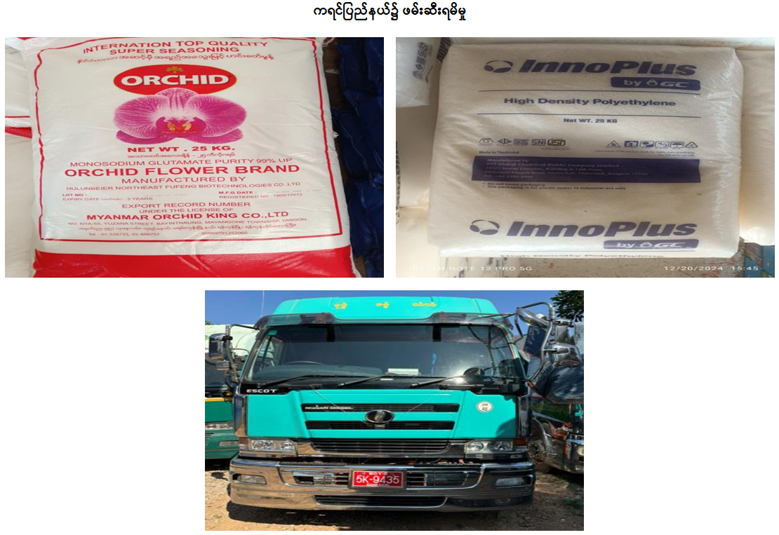 ၄။ ထို့အတူ ကရင်ပြည်နယ်တရားမဝင်ကုန်သွယ်မှုတိုက်ဖျက်ရေးအထူးအဖွဲ့၏ စီမံခန့်ခွဲမှုဖြင့် တာဝန်ကျပူးပေါင်းအဖွဲ့များက စစ်ဆေးမှုများ ဆောင်ရွက်ခဲ့ရာ ရဲသာယာယီယာဉ်စစ်ကွင်း၌ မော်တော်ယာဉ် (၁) စီးပေါ်မှ တရားဝင်စာရွက်စာတမ်းအထောက်အထား တင်ပြနိုင်ခြင်းမရှိသည့် လုပ်ငန်းသုံးပစ္စည်း (၂) မျိုး၊ စားသောက်ကုန်ပစ္စည်း (၁) မျိုး (ခန့်မှန်းတန်ဖိုးငွေကျပ် ၃၀,၀၀၀,၀၀၀) နှင့် အဆိုပါပစ္စည်းများ တင်ဆောင်လာသည့် Nissan Diesel Tractor Head (၁) စီးနှင့် နောက်တွဲယာဉ် (၁) တွဲ (ခန့်မှန်းတန်ဖိုးငွေကျပ် ၇၀,၀၀၀,၀၀၀)၊ စုစုပေါင်း (ခန့်မှန်းတန်ဖိုးငွေကျပ် ၁၀၀,၀၀၀,၀၀၀) ကို ဖမ်းဆီးရမိခဲ့ပြီး အကောက်ခွန်လုပ်ထုံးလုပ်နည်းများနှင့်အညီ အရေးယူဆောင်ရွက်လျက်ရှိပါသည်။
