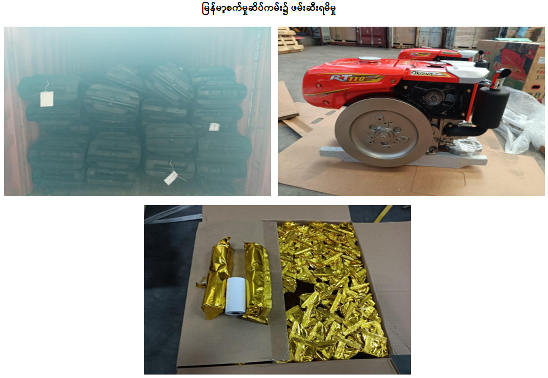 ၁။ တရားမဝင်ကုန်သွယ်မှုတိုက်ဖျက်ရေးဦးဆောင်ကော်မတီ၏ ကြီးကြပ်ကွပ်ကဲမှုဖြင့် တရားမဝင် ကုန်သွယ်မှုများကို ဥပဒေနှင့်အညီ ထိရောက်စွာ တားဆီးအရေးယူနိုင်ရေး ဆောင်ရွက်လျကရှိရာ ဒီဇင်ဘာလ ၂၀ ရက်တွင် မန္တလေးတိုင်းဒေသကြီး တရားမဝင်ကုန်သွယ်မှုတိုက်ဖျက်ရေးအထူးအဖွဲ့၏ စီမံခန့်ခွဲမှုဖြင့် တာဝန်ကျပူးပေါင်းအဖွဲ့များကစစ်ဆေးမှုများ ဆောင်ရွက်ခဲ့ရာ ကျောက်ဆည်မြို့၊ မြို့ရှောင်လမ်း၌ မော်တော်ယာဉ် (၁) စီးပေါ်မှ တရားဝင်စာရွက်စာတမ်းအထောက်အထား တင်ပြနိုင်ခြင်းမရှိသည့် လုပ်ငန်းသုံးပစ္စည်း (၄) မျိုး၊ လူသုံးကုန်ပစ္စည်း (၃) မျိုး (ခန့်မှန်းတန်ဖိုးငွေကျပ် ၃၇,၁၈၀,၆၄၅) နှင့် အဆိုပါပစ္စည်းများ တင်ဆောင်လာသည့် Hino Profia Truck (၁) စီး (ခန့်မှန်းတန်ဖိုးငွေကျပ် ၃၀,၀၀၀,၀၀၀) ကိုလည်းကောင်း၊ ရန်ကုန် - မန္တလေးအမြန်လမ်း မိုင်တိုင်အမှတ် (၃၆၆/၆)၊ တံခွန်တိုင်အဝိုင်းအနီး၌ မော်တော်ယာဉ် (၁) စီးပေါ်မှ တရားဝင်စာရွက်စာတမ်းအထောက်အထားတင်ပြနိုင်ခြင်းမရှိသည့် လုပ်ငန်းသုံးပစ္စည်း (၇) မျိုး၊ လူသုံးကုန်ပစ္စည်း (၃) မျိုး (ခန့်မှန်းတန်ဖိုးငွေကျပ် ၃၄,၈၉၅,၀၀၄) နှင့် အဆိုပါပစ္စည်းများ တင်ဆောင်လာသည့် Sung Long Bus (၁)စီး (ခန့်မှန်းတန်ဖိုး ငွေကျပ် ၇၀,၀၀၀,၀၀၀) ကိုလည်းကောင်း၊ မန္တလေးဘူတာကြီး၌ ရန်ကုန် - မန္တလေးအဆန်ရထား၊ ပါဆယ် (၁) ရထားတွဲပေါ်မှ တရားဝင်စာရွက်စာတမ်းအထောက်အထား တင်ပြနိုင်ခြင်းမရှိသည့် လူသုံးကုန်ပစ္စည်း (၄) မျိုး (ခန့်မှန်းတန်ဖိုးငွေကျပ် ၄၄,၀၁၇,၀၀၀)ကိုလည်းကောင်း၊ စုစုပေါင်း (ခန့်မှန်းတန်ဖိုးငွေကျပ် ၂၁၆,၀၉၂,၆၄၉) ကို ဖမ်းဆီးရမိခဲ့ပြီး အကောက်ခွန်လုပ်ထုံးလုပ်နည်းများနှင့်အညီ အရေးယူဆောင်ရွက်လျက်ရှိပါသည်။