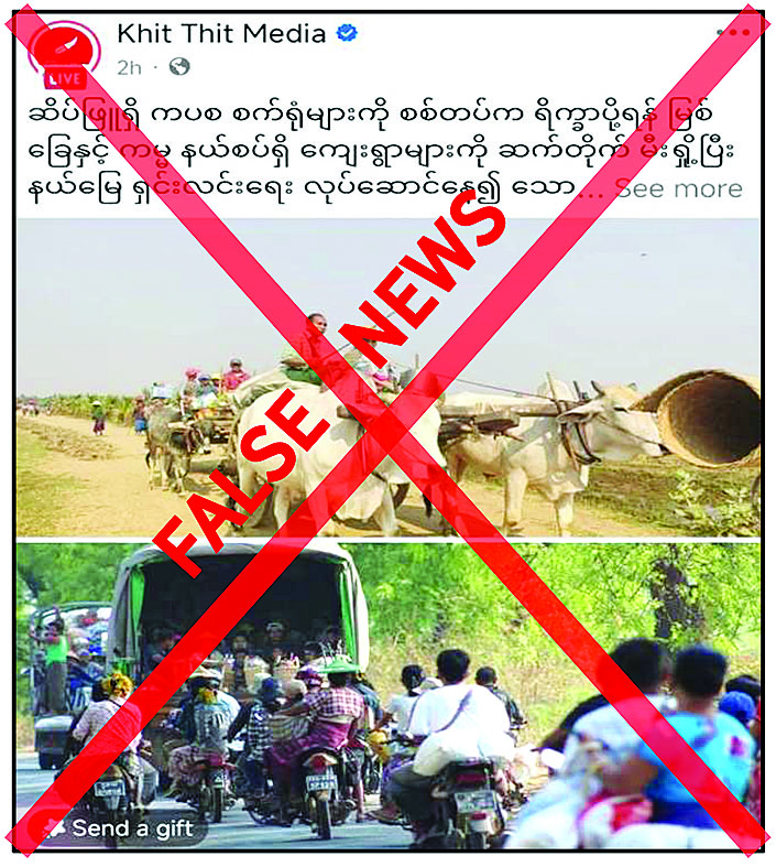မကွေးတိုင်းဒေသကြီး ဆိပ်ဖြူမြို့နယ် မြစ်ခြေနှင့် ကမ္မနယ်စပ်ရှိ ကျေးရွာများကို လုံခြုံရေးတပ်ဖွဲ့ဝင်များက မီးရှို့ခဲ့သဖြင့် ပြည်သူများ ထွက်ပြေးတိမ်းရှောင်နေရသည်ဟု တရားမဝင် ပြည်ဖျက်မီဒီယာများက သတင်းတု၊ သတင်းအမှားများ မဟုတ်မမှန်ရေးသားဖြန့်ဝေလျက်ရှိကြောင်း တွေ့ရှိရသည်။