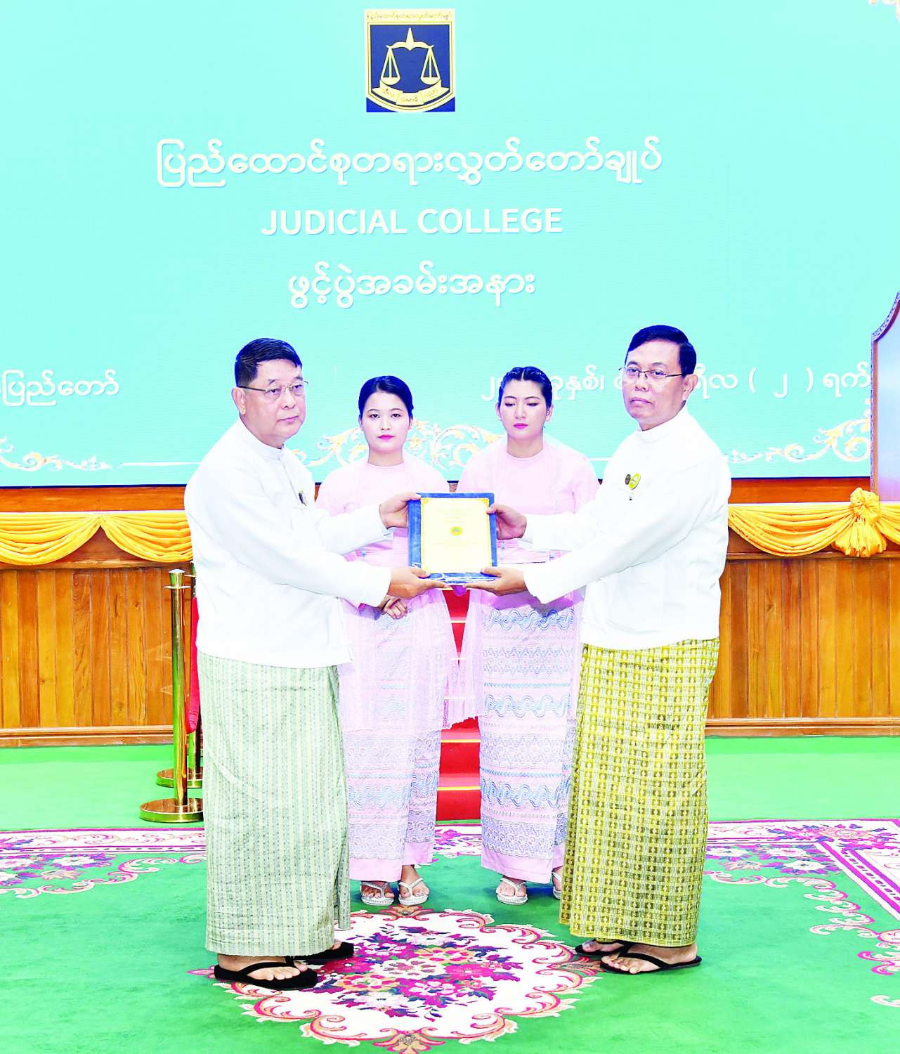 ထို့နောက် ဆောက်လုပ်ရေးဝန်ကြီးဌာန ပြည်ထောင်စုဝန်ကြီးက Judicial College အဆောက်အဦသစ်နှင့်သက်ဆိုင်သည့် စာရွက်စာတမ်းများကို ပြည်ထောင်စုတရားသူကြီးချုပ်ထံသို့ လွှဲပြောင်းပေးအပ်သည်။ ယင်းနောက် ပြည်ထောင်စုတရားသူကြီးချုပ်က နိုင်ငံတော်စီမံအုပ်ချုပ်ရေးကောင်စီအတွင်းရေးမှူးထံ Judicial College အဆောက်အဦသစ်ဖွင့်ပွဲအထိမ်းအမှတ်လက်ဆောင်အား ဂါရဝပြုပေးအပ်သည်။