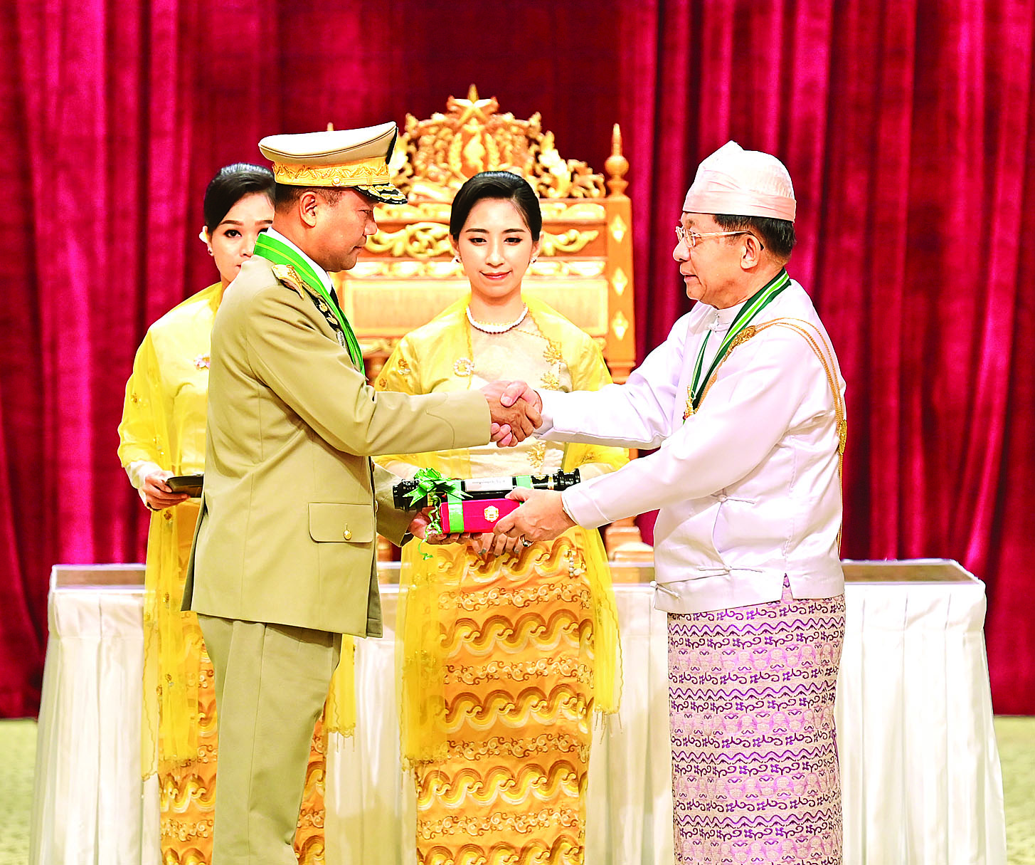 (၇၇) နှစ်မြောက် လွတ်လပ်ရေးနေ့အထိမ်းအမှတ် ဂုဏ်ထူးဆောင်ဘွဲ့များ ချီးမြှင့်အပ်နှင်းခြင်းအခမ်းအနားကို ယနေ့နံနက်ပိုင်းတွင် နိုင်ငံတော်စီမံအုပ်ချုပ်ရေးကောင်စီဥက္ကဋ္ဌရုံး သဘင်ဆောင်၌ကျင်းပရာ နိုင်ငံတော်စီမံအုပ်ချုပ်ရေးကောင်စီဥက္ကဋ္ဌ နိုင်ငံတော်ဝန်ကြီးချုပ် ဗိုလ်ချုပ်မှူးကြီးသတိုးမဟာသရေစည်သူ သတိုးသီရိသုဓမ္မ မင်းအောင်လှိုင် တက်ရောက်အမှာစကားပြောကြားပြီး ဂုဏ်ထူးဆောင်ဘွဲ့များ ချီးမြှင့်အပ်နှင်းသည်။