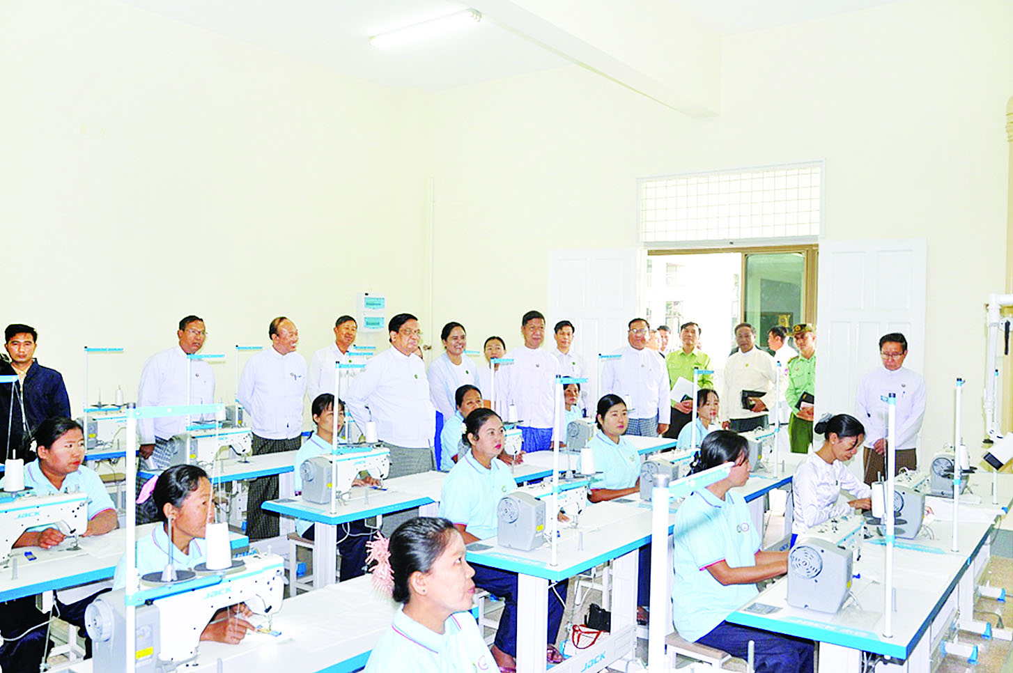 ယင်းနောက် ပြည်ထောင်စုဝန်ကြီးနှင့် အဖွဲ့ဝင်များသည် အဝတ်အထည်ချုပ်လုပ်မှုသင်တန်းခန်းမအတွင်းရှိ သင်ထောက်ကူပစ္စည်းများ၊ အဝတ်အထည်ချုပ်လုပ်မှုနှင့် ပတ်သက်၍ သင်ကြားပေးနေမှုတို့ကို လှည့်လည်အားပေးကြည့်ရှုသည်။