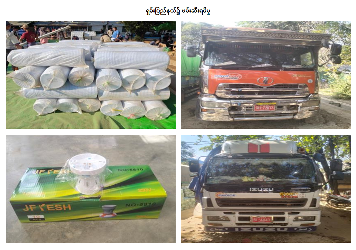 ၅။ ထို့အတူ ရှမ်းပြည်နယ် တရားမဝင်ကုန်သွယ်မှုတိုက်ဖျက်ရေးအထူးအဖွဲ့၏ စီမံခန့်ခွဲမှုဖြင့် တာဝန်ကျပူးပေါင်းအဖွဲ့များက စစ်ဆေးမှုများ ဆောင်ရွက်ခဲ့ရာ ကျိုင်းတုံမြို့၊ မြို့ရှောင်လမ်း၊ နောင်နွန်းကျေးရွာအနီး၌ မော်တော်ယာဉ် (၁) စီးပေါ်မှ တရားဝင်စာရွက်စာတမ်းအထောက်အထား တင်ပြနိုင်ခြင်းမရှိသည့် လူသုံးကုန်ပစ္စည်း (၁) မျိုး (ခန့်မှန်းတန်ဖိုးငွေကျပ် ၂၂,၅၀၀,၀၀၀) နှင့် အဆိုပါပစ္စည်းများ တင်ဆောင်လာသည့် Mitsubishi Canter Truck (၁)စီး (ခန့်မှန်းတန်ဖိုးငွေကျပ် ၃၀,၀၀၀,၀၀၀)ကို လည်းကောင်း၊ မယ်ယန်းကုန်သွယ်ရေးစခန်းအလွန် မိုင်းကိုးကျေးရွာအုပ်စု၊ ရန်နိုင် (၁) ကျေးရွာအနီး၌ ရပ်တန့်ထားသော မော်တော်ယာဉ် (၁၀) စီးပေါ်မှ တရားဝင်စာရွက်စာတမ်းအထောက်အထား တင်ပြနိုင်ခြင်းမရှိသည့် လုပ်ငန်းသုံးပစ္စည်း (၃၈) မျိုး၊ လူသုံးကုန်ပစ္စည်း (၁၈) မျိုး (ခန့်မှန်းတန်ဖိုးငွေကျပ် ၃၀၈,၂၉၄,၉၆၃) နှင့် အဆိုပါပစ္စည်းများ တင်ဆောင်လာသည့် Nissan Diesel Truck (၃) စီး၊ Mitsubishi Fuso Truck (၃) စီး၊ Isuzu Giga Truck (၂) စီး၊ Hino Profia Truck (၁) စီး၊ စက်မှုဇုန်ထုတ် Mahar Nwe Truck (၁)စီး (ခန့်မှန်းတန်ဖိုးငွေကျပ် ၄၁၅,၀၀၀,၀၀၀) ကိုလည်းကောင်း၊ စုစုပေါင်း (ခန့်မှန်းတန်ဖိုးငွေကျပ် ၇၇၅,၇၉၄,၉၆၃) ကို ဖမ်းဆီးရမိခဲ့ပြီး အကောက်ခွန်လုပ်ထုံးလုပ်နည်းများနှင့်အညီ အရေးယူဆောင်ရွက်လျက်ရှိပါသည်။