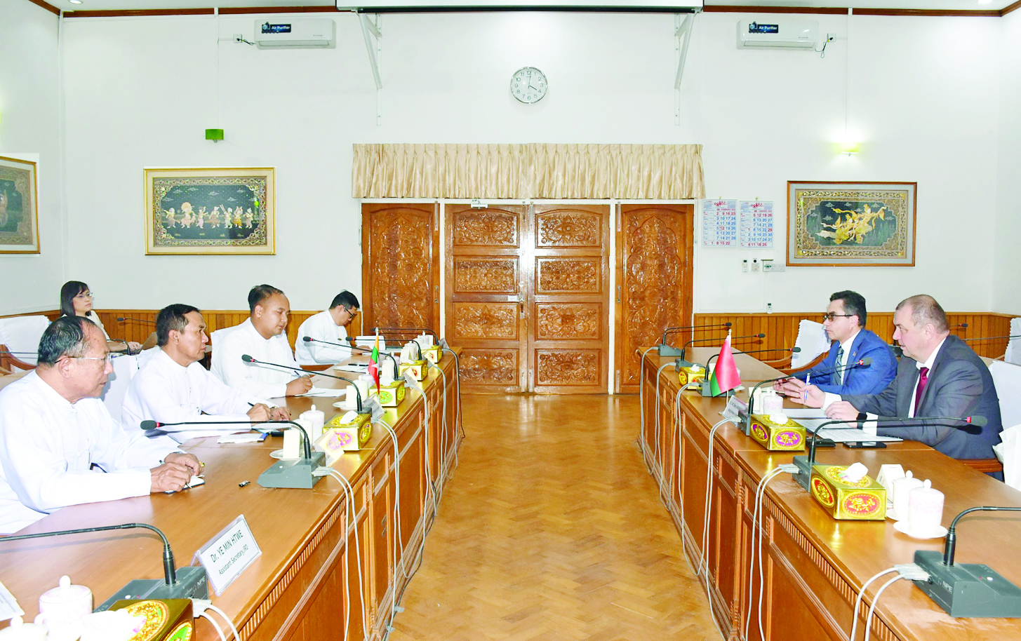 ကျန်းမာရေးဝန်ကြီးဌာန ဒုတိယဝန်ကြီးဒေါက်တာအေးထွန်းသည် ဘယ်လာရုစ်နိုင်ငံ ကျန်းမာရေးဝန်ကြီးဌာန ဒုတိယဝန်ကြီး H.E. Mr. Barys ANDRASIUK ခေါင်းဆောင်သော ကိုယ်စားလှယ်အဖွဲ့အား ယနေ့ညနေပိုင်းတွင် နေပြည်တော်ရှိ ကျန်းမာရေးဝန်ကြီးဌာနအစည်းအဝေးခန်းမ၌ လက်ခံတွေ့ဆုံသည်။